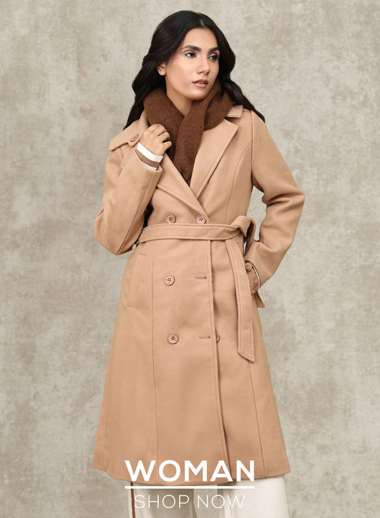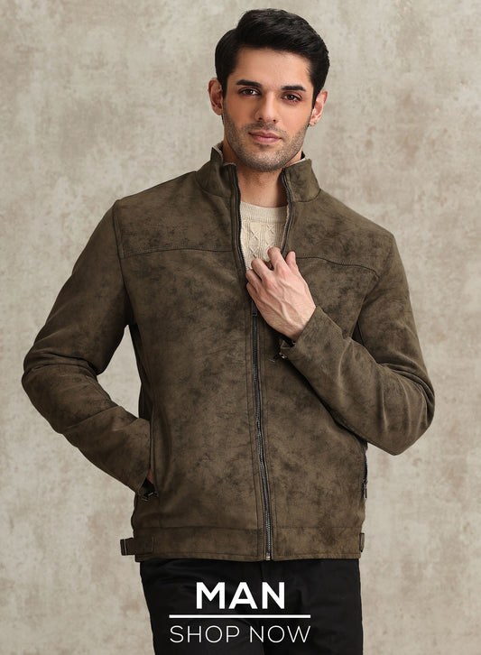 Features a classic v-neck vest layered under a soft jacket.subtle grain in the fabric adds depth to the neutral tone.finished with wide-leg bottoms for relaxed movement.
