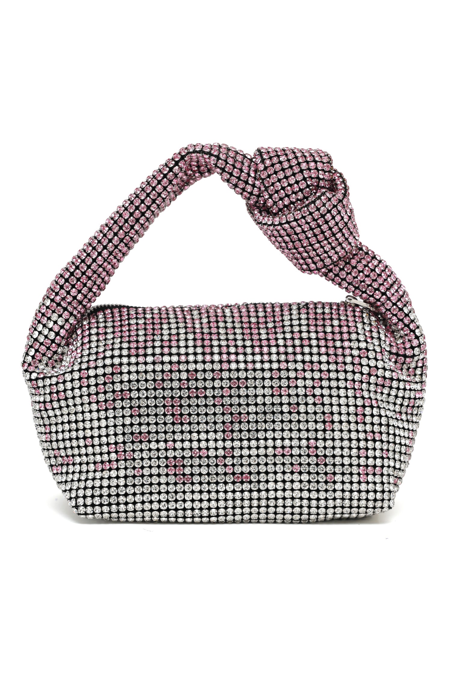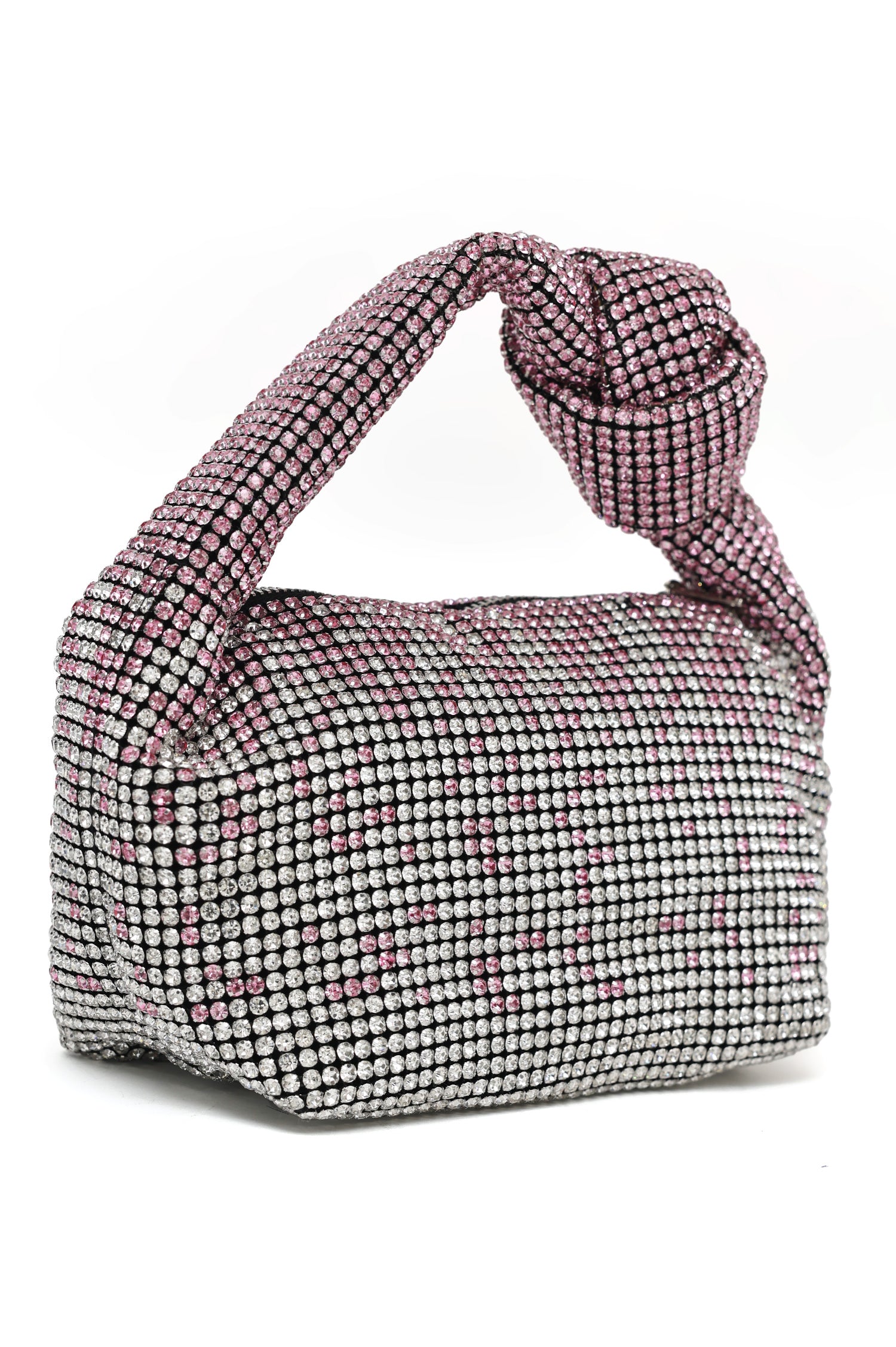 Glamorous shoulder bag featuring an all-over crystal embellishment and a chic knotted handle design. Compact yet eye-catching, it’s perfect for elevating evening outfits or adding a dazzling touch to special occasions.