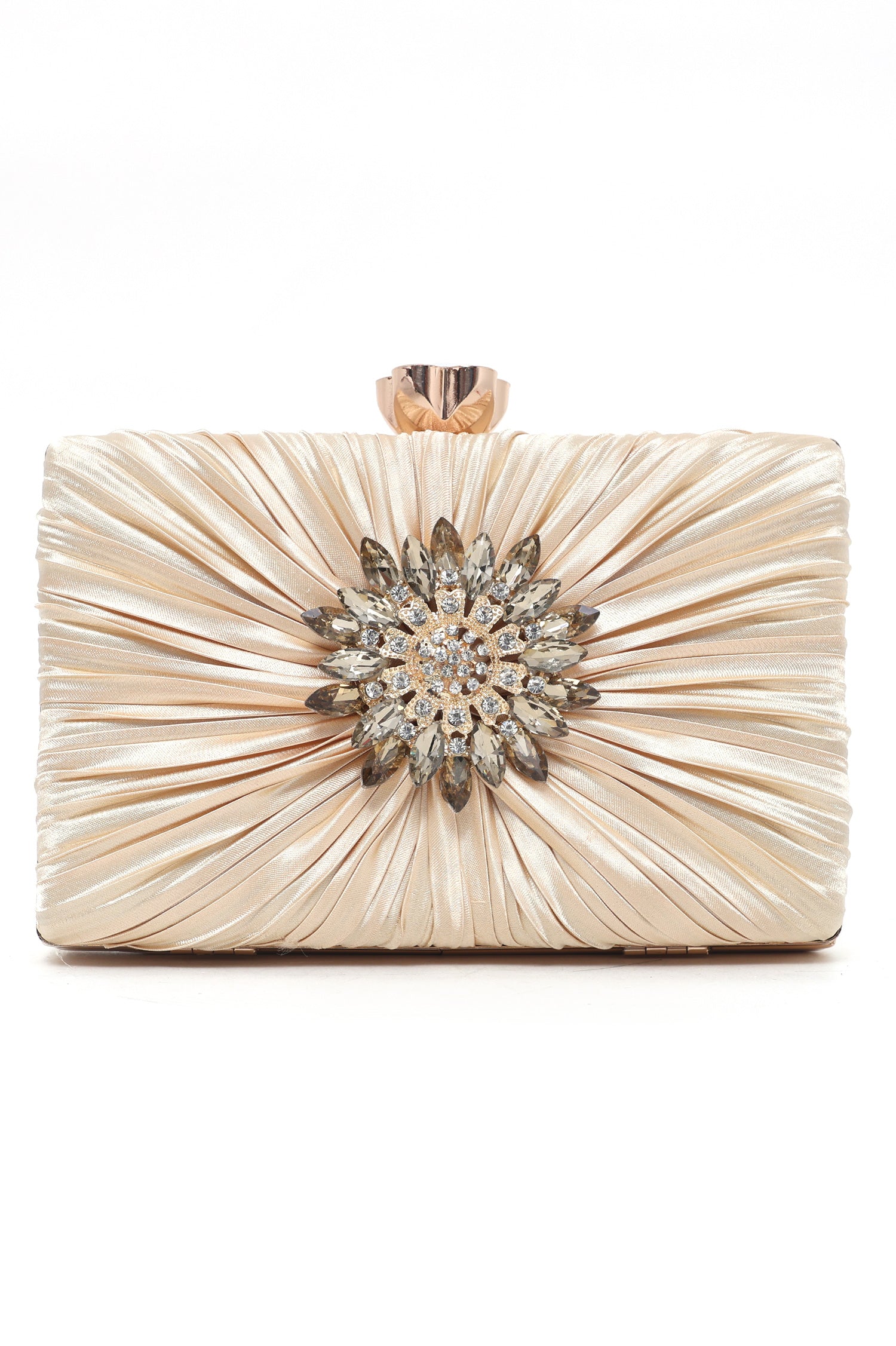 Exude elegance with the Radiance Gemstone Clutch, featuring a beautifully satin exterior and a dazzling gemstone centerpiece. This structured clutch is finished with a polished metal clasp and includes a detachable gold-tone chain for versatile wear. Perfect for formal occasions, this clutch combines luxurious details with a timeless design.