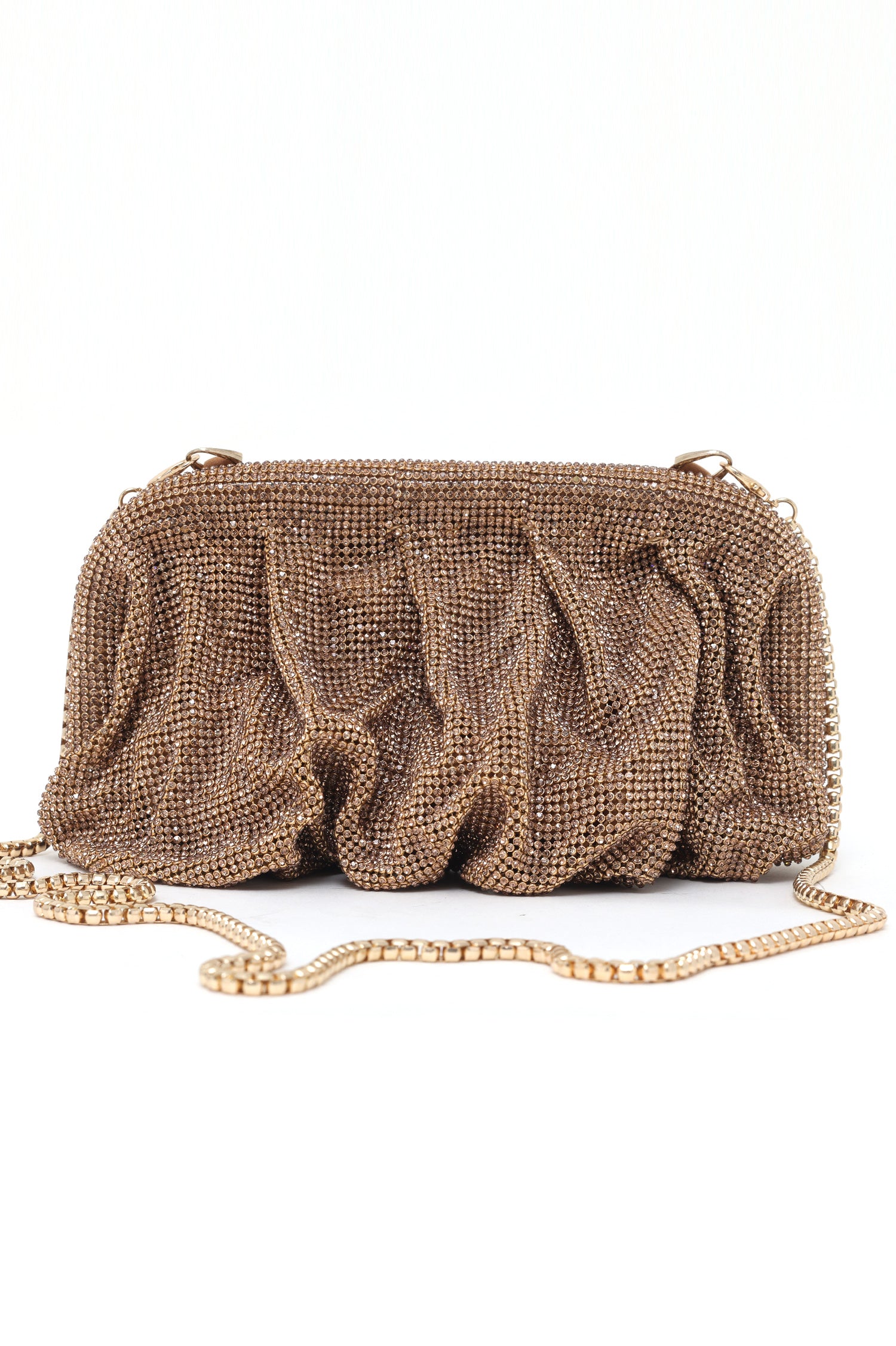 Elevate your evening look with the Emerald Luxe Gathered Clutch, featuring a stunning gathered silhouette adorned with sparkling embellishments. This chic clutch comes with a sleek chain strap, allowing for versatile styling as a shoulder bag. Perfect for special occasions or adding a touch of luxury to your outfit, this clutch is the epitome of sophisticated glamour.