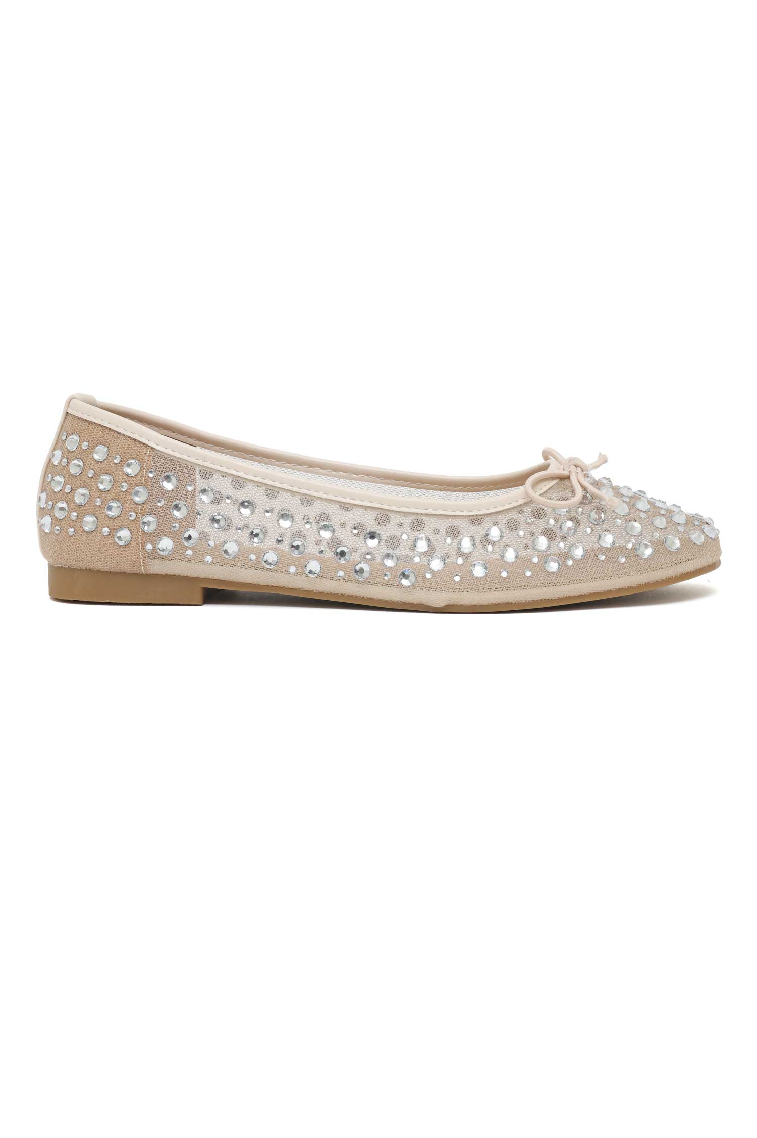 An airy mesh construction adorned with scattered crystal stones defines these ballet flats. The soft structure, accented with a delicate bow, brings refined sparkle to everyday styling.