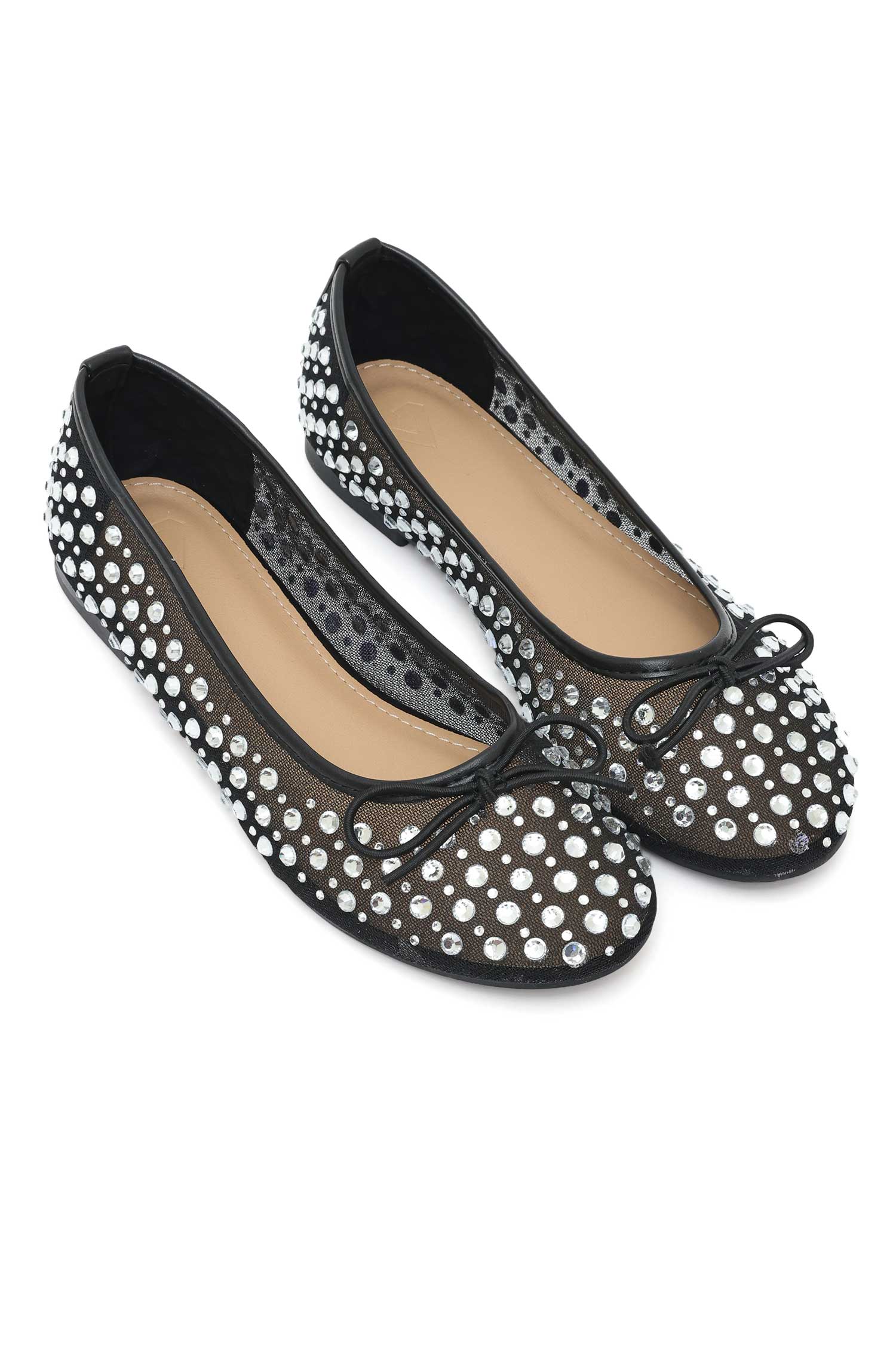 An airy mesh construction adorned with scattered crystal stones defines these ballet flats. The soft structure, accented with a delicate bow, brings refined sparkle to everyday styling.