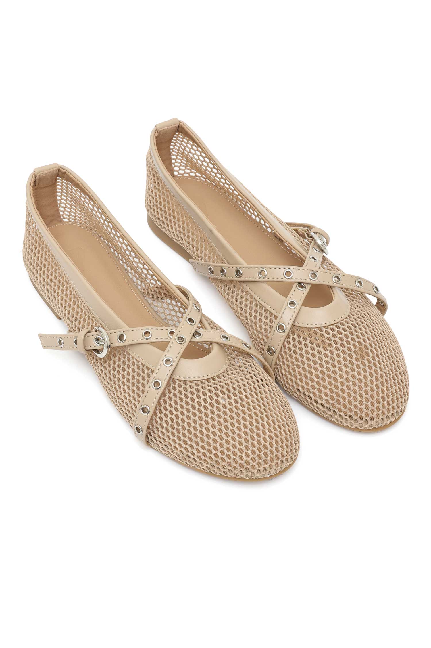 Defined by honeycomb mesh and intertwined studded straps, these flats are built for fast-paced city life. Tough, lightweight, and stylishly unconventional for offbeat wardrobes.