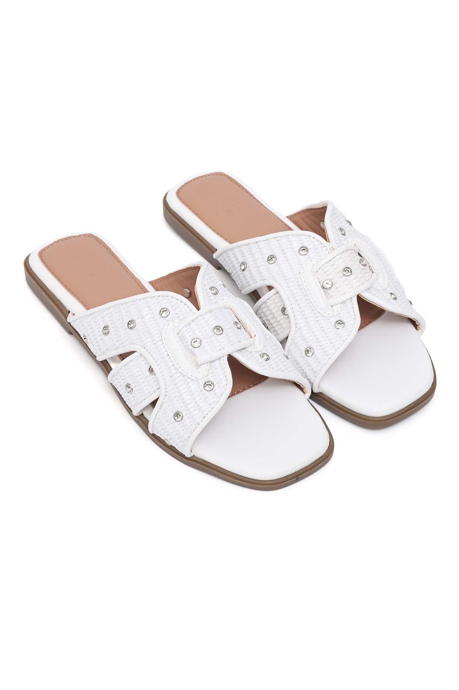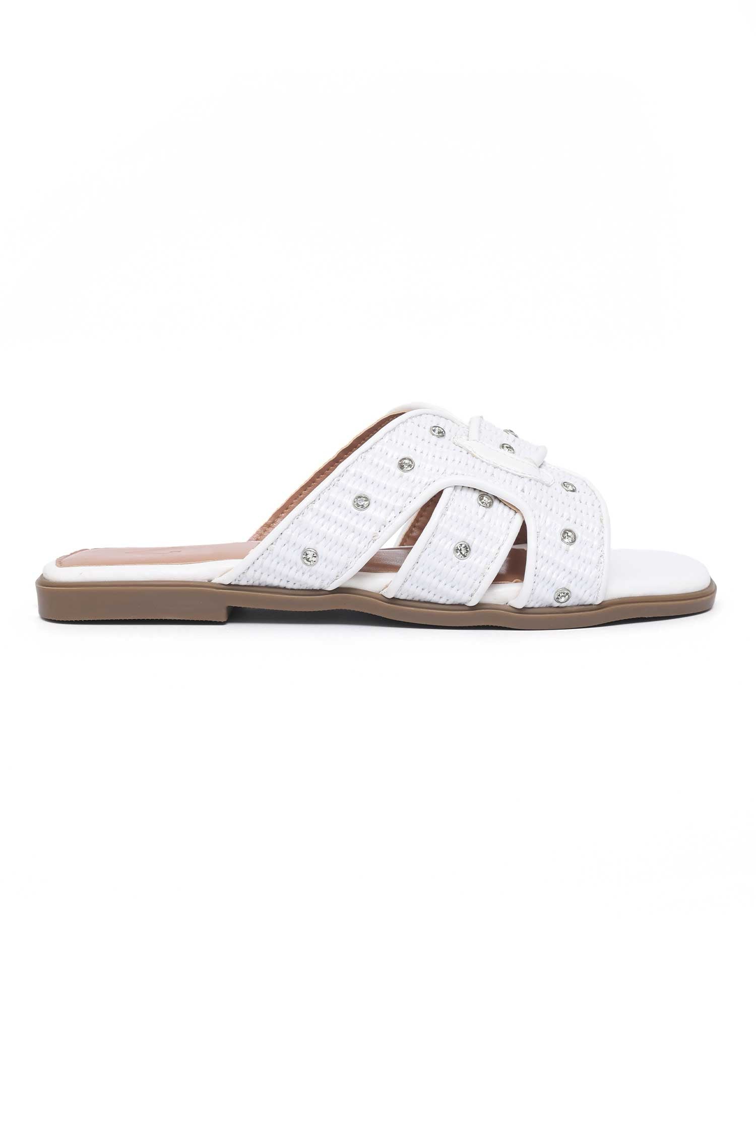 Sparkling accents scattered across airy woven bands. Chic slip-on design for effortless elegance. A radiant choice for weekend outings.