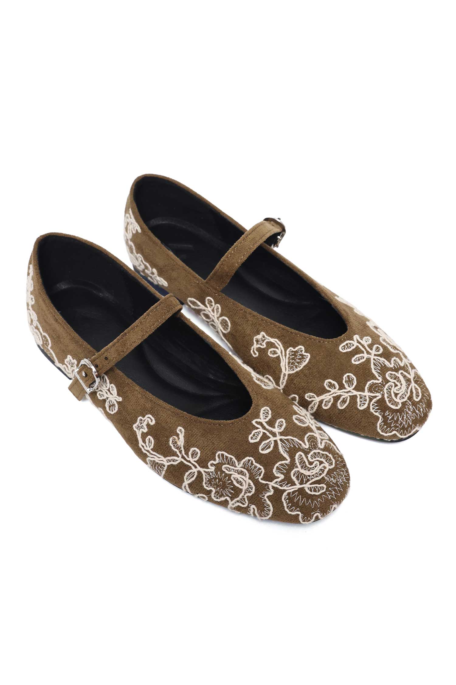 A rounded front that emphasizes plush, textile-like texture. The embroidery forms botanical shapes that give depth to the surface. The Mary Jane strap adds a classic closure while preserving a clean line.