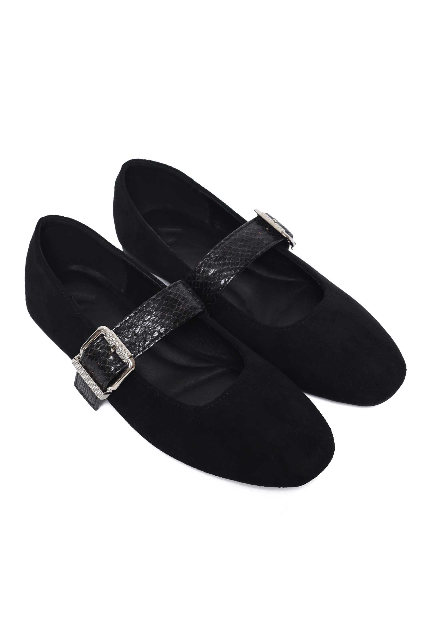 The shape centers a stable, rounded toe and even profile. The material reads as a soft, suede-like fabric with a refined nap. The buckle pair adds a touch of metallic texture that enhances depth. The overall form supports graceful movement and all-day comfort.