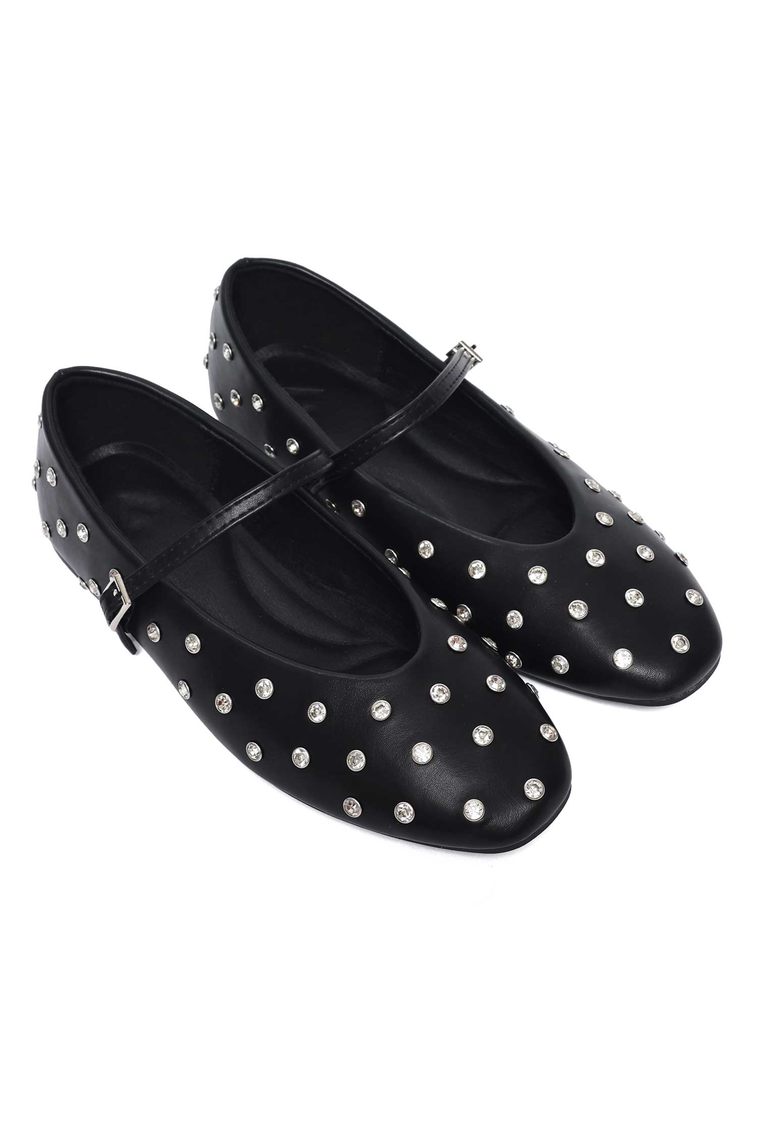 The rounded toe anchors the design with a refined, low profile. The upper offers a tactile suede-like texture with scattered studs for subtle texture. The buckle features a delicate texture that enhances shine.