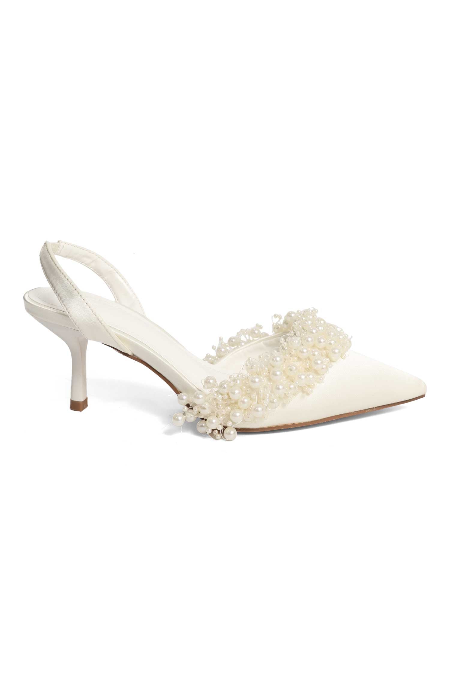 The silhouette presents a long, tapered toe and a slender heel. The upper’s texture is smooth with a soft luminosity. The jeweled cluster across the vamp creates a vibrant, rhythmic glow.