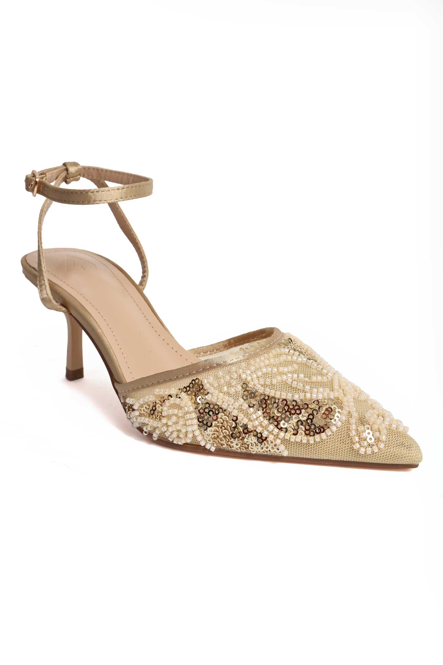 The shape features a crisp, elongated toe and a delicate sling strap. The bead cluster across the vamp yields a rich, tactile surface. The buckle adds a touch of metallic polish without bulk. The interior padding ensures comfortable progression from morning to night.