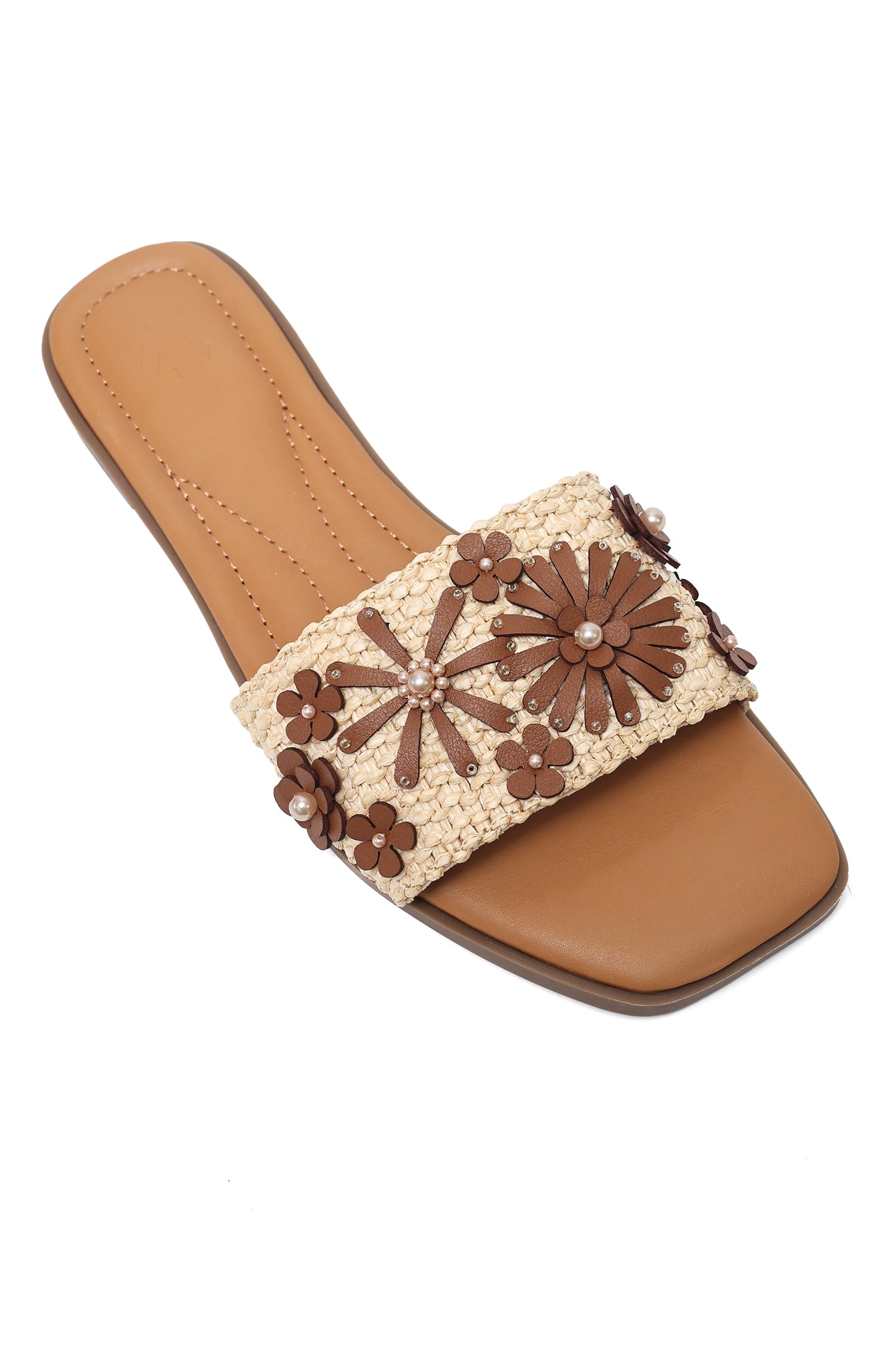 A modern slide featuring textured strap with floral details. The clean flat design keeps it lightweight and comfortable. Perfect for summer styling.