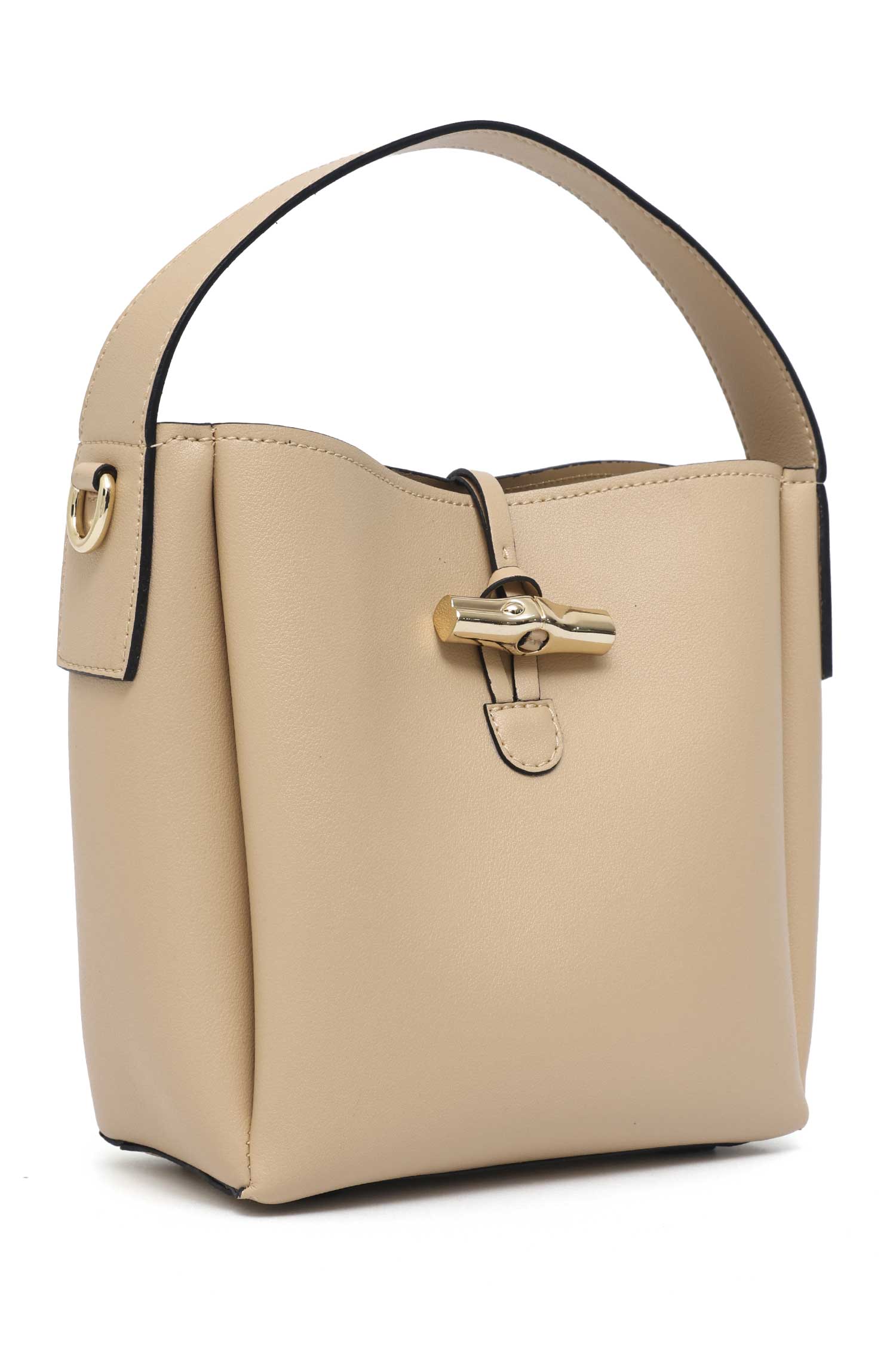 Streamlined handle bag with golden barrel clasp and top loop. Sculpted with urban softness and utility charm. Refined touch for daily looks.