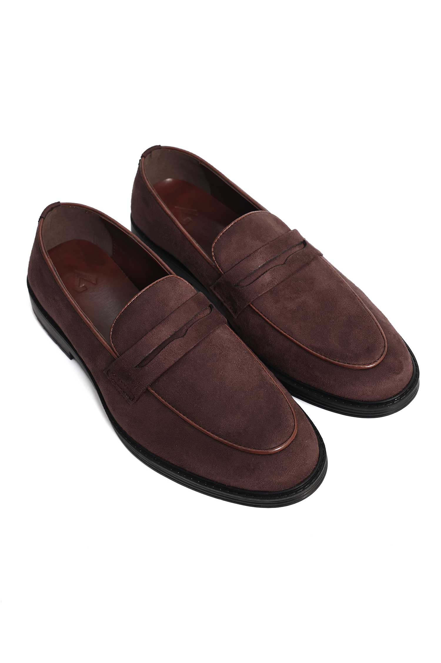 The suede texture offers a plush, even nap that feels premium to the touch. The penny strap introduces a timeless line across the vamp.