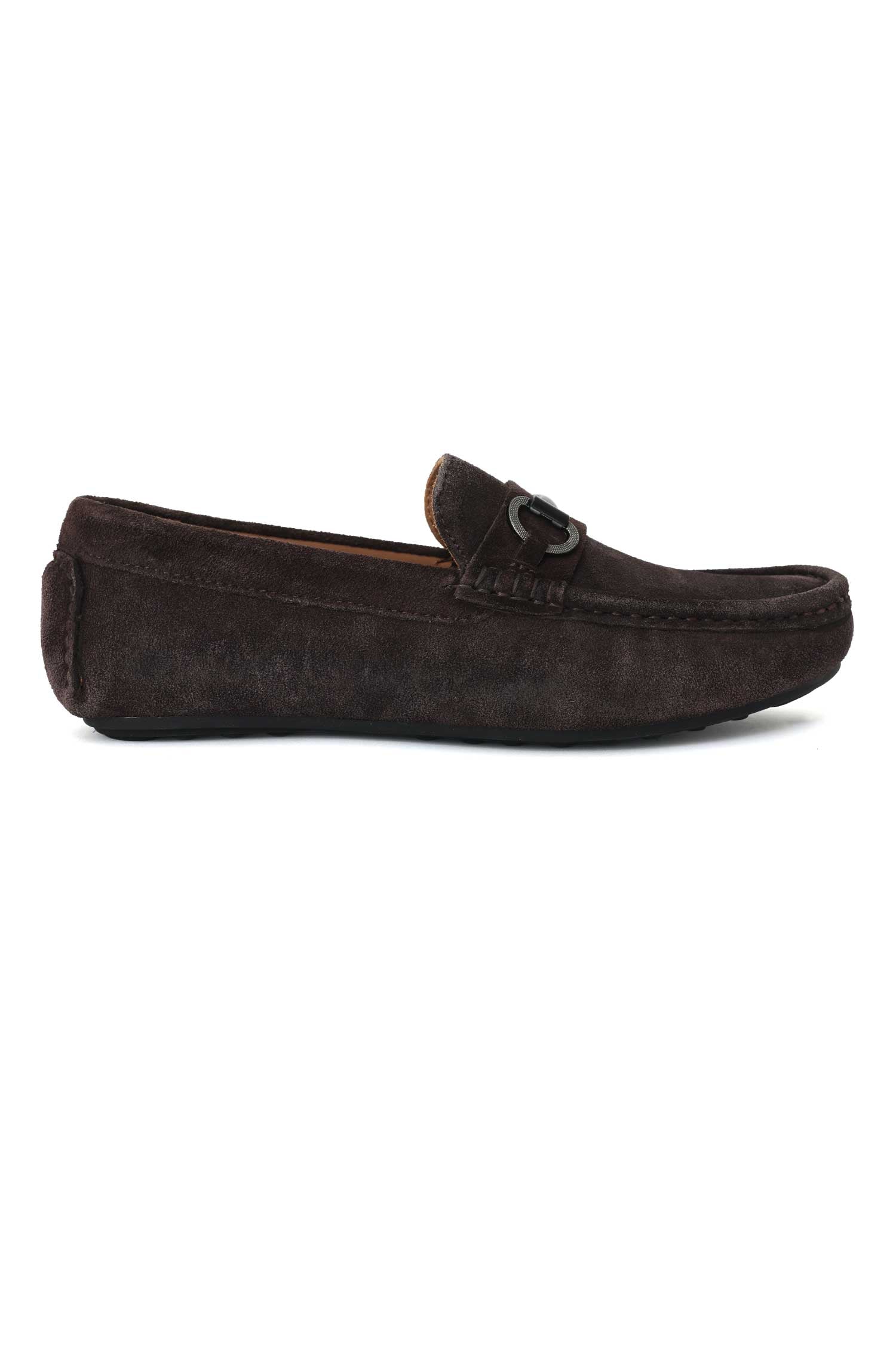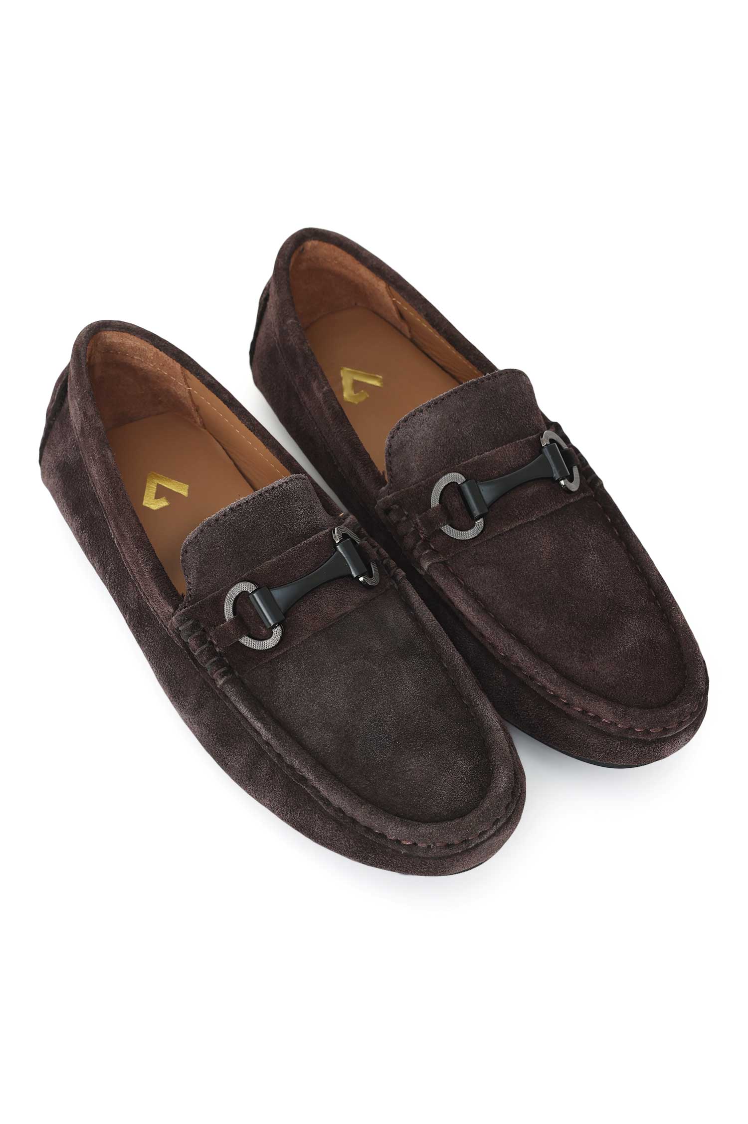 A sophisticated moccasin-style loafer with tonal stitching and a bold metal bit. The soft suede finish enhances its tailored silhouette. Built for classic wardrobes with contemporary edge.