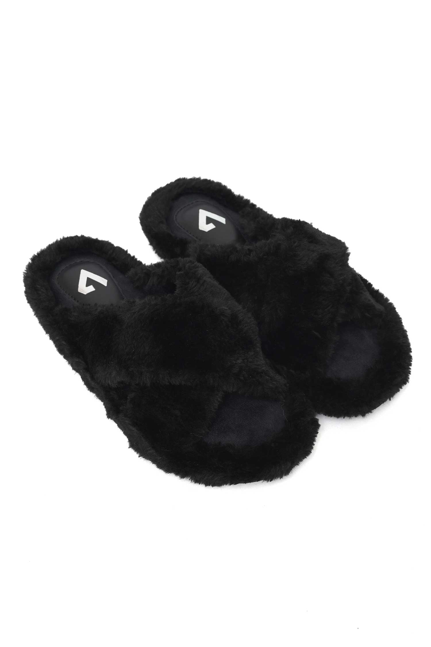 Stylish cross-strap slides with soft furry texture. A lightweight build makes them easy to wear. A blend of comfort and casual home fashion.