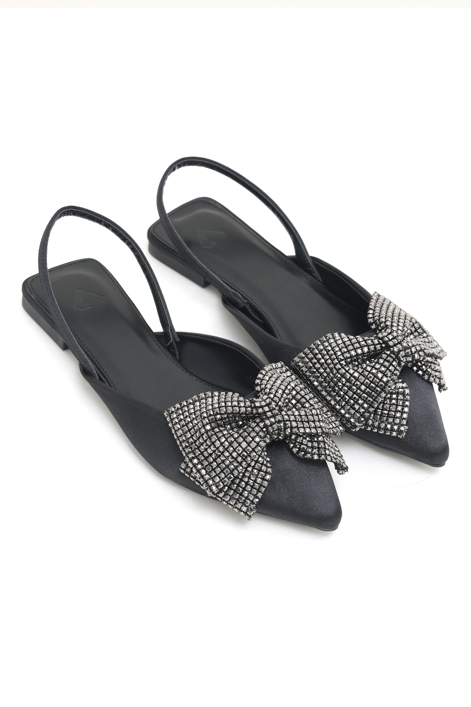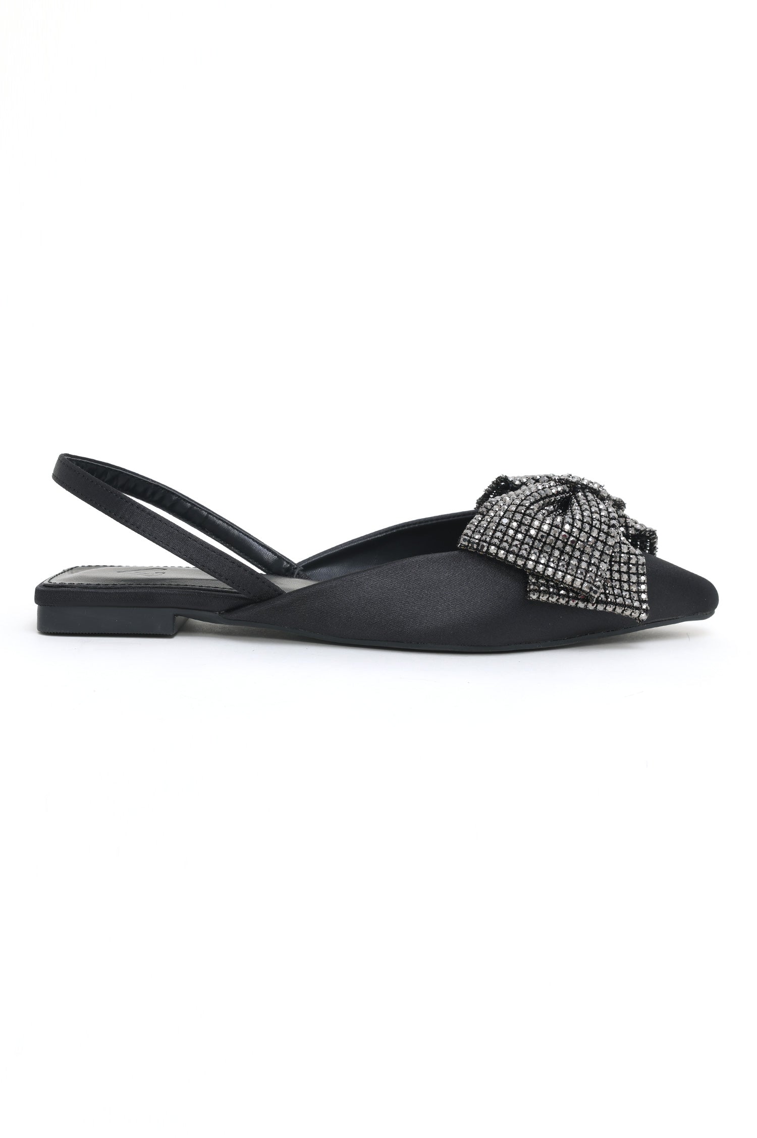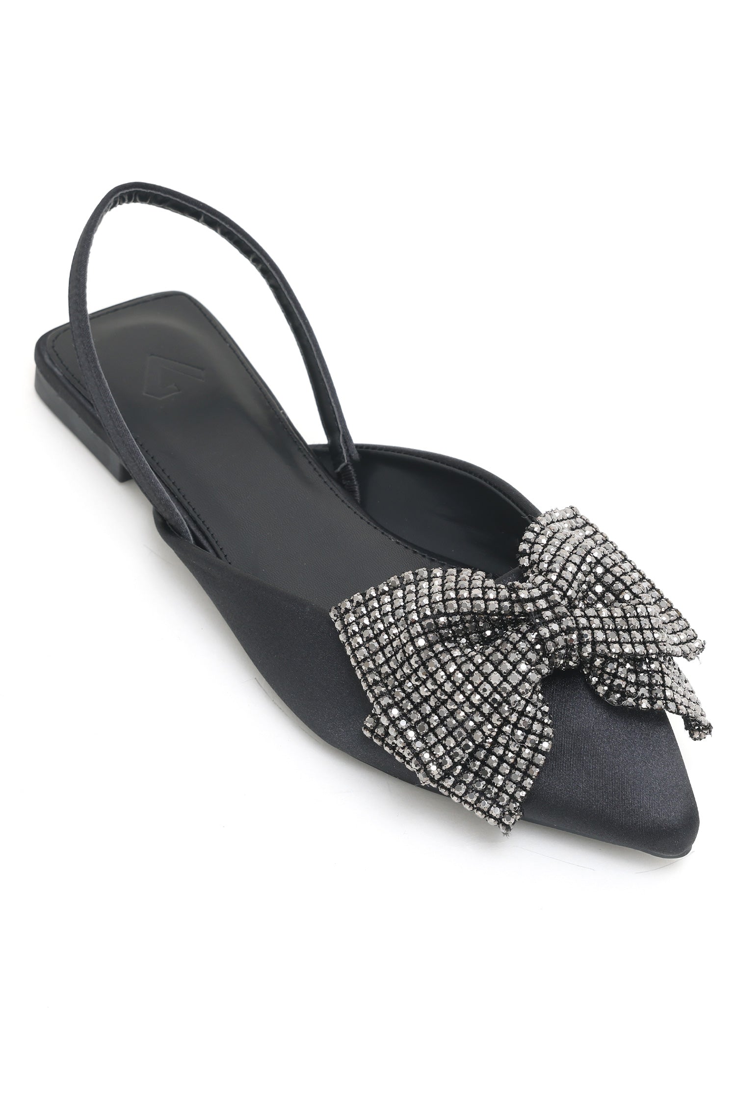 Featuring a pointed toe and embellished with a radiant bow, these satin slingback flats add a touch of elegance to any outfit. Lightweight and comfortable, ideal for versatile styling.