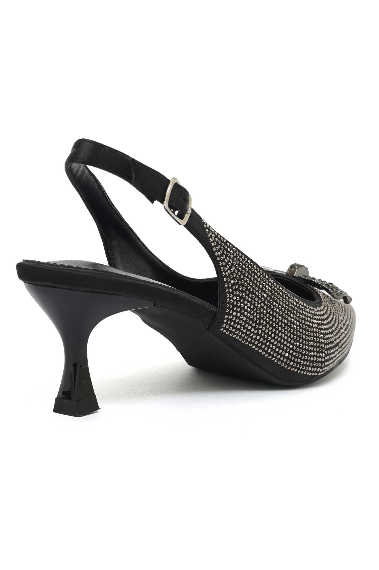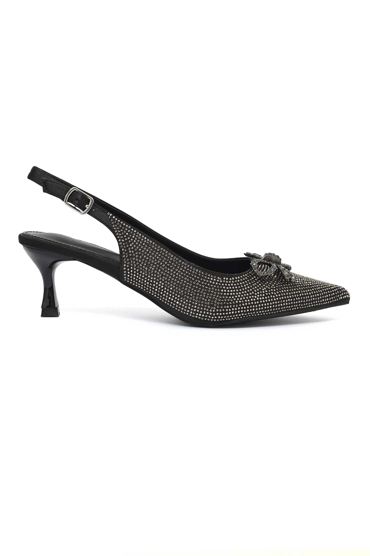 Dressed in sparkling rhinestones, this pointed slingback features a dainty embellished bow at the vamp. The kitten heel and sleek silhouette add a touch of elegance. A show-stealing choice for evening looks.