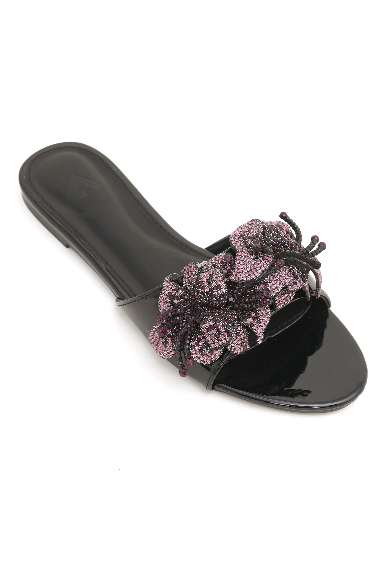 Elevate your summer style with these stunning women's slides featuring a beautiful embellished flower design on the toe. Crafted in luxurious patent material, these sandals are perfect for adding a touch of elegance to any outfit. Whether you're heading to the beach or a party, these sandals will be your go-to accessory for the season. Step out in style with these chic and comfortable slides.