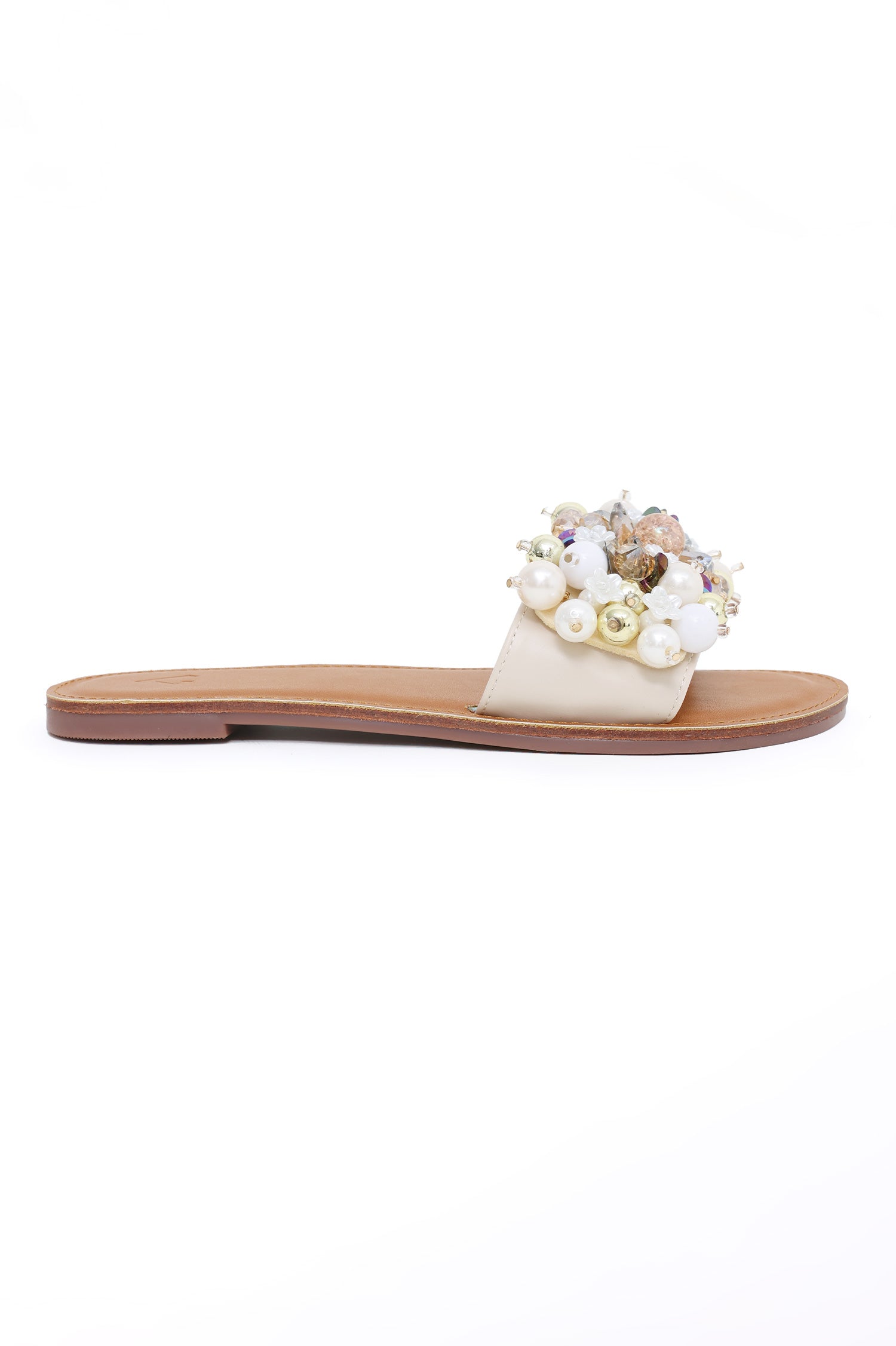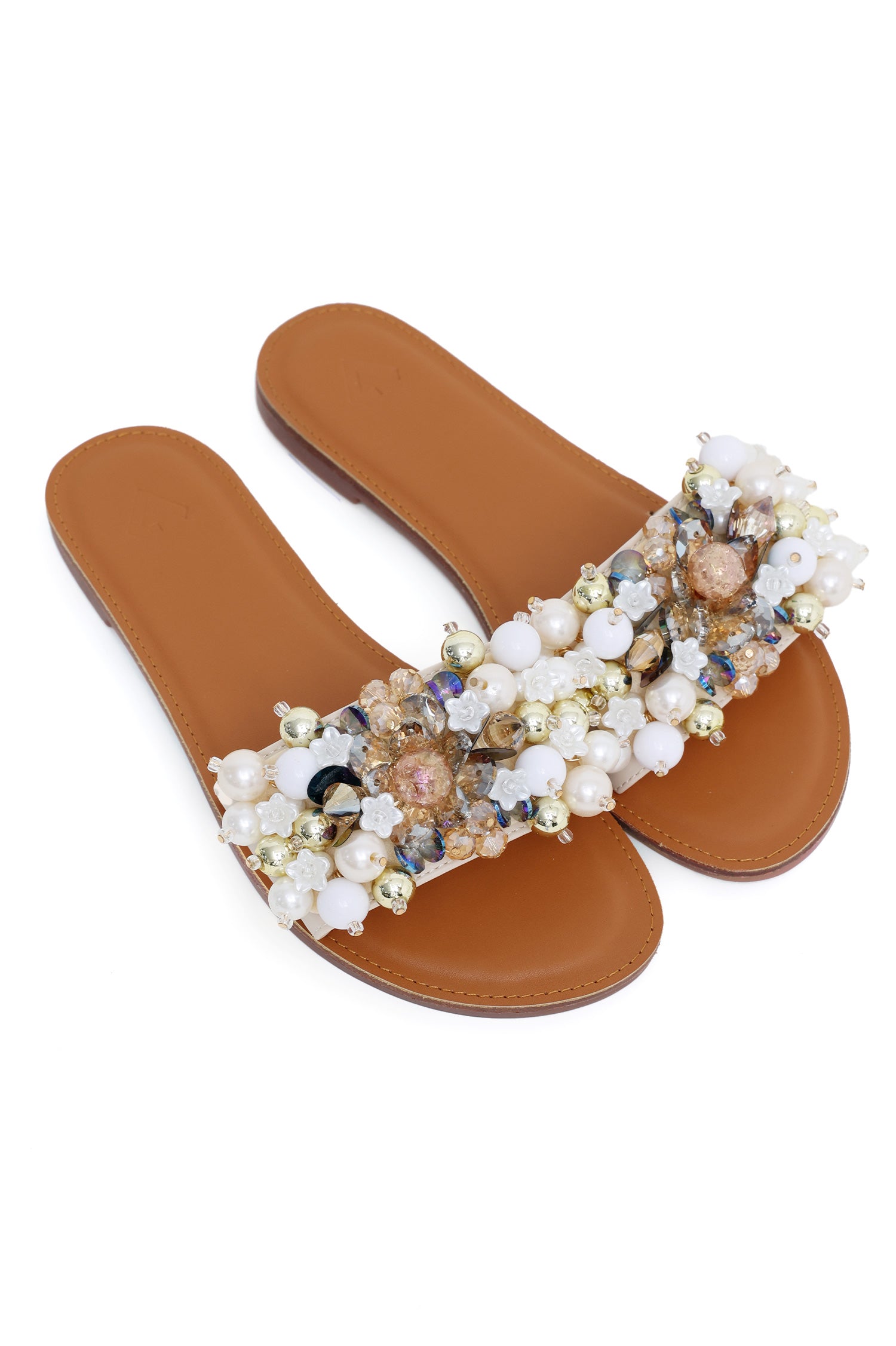 Step into elegance with these stunning women's slide sandals adorned with delicate pearls and sparkling crystals. Crafted with comfort in mind, these slides feature a comfortable foot-bed and a secure grip, ensuring you can strut your stuff with confidence.
