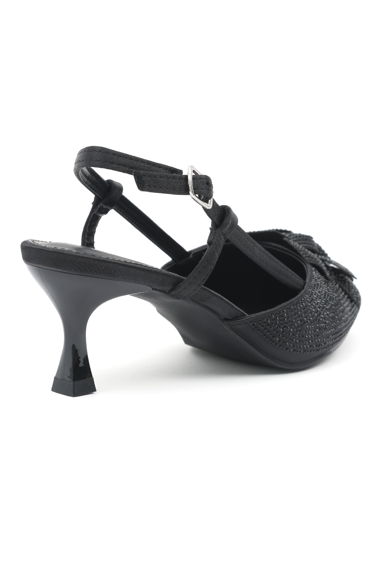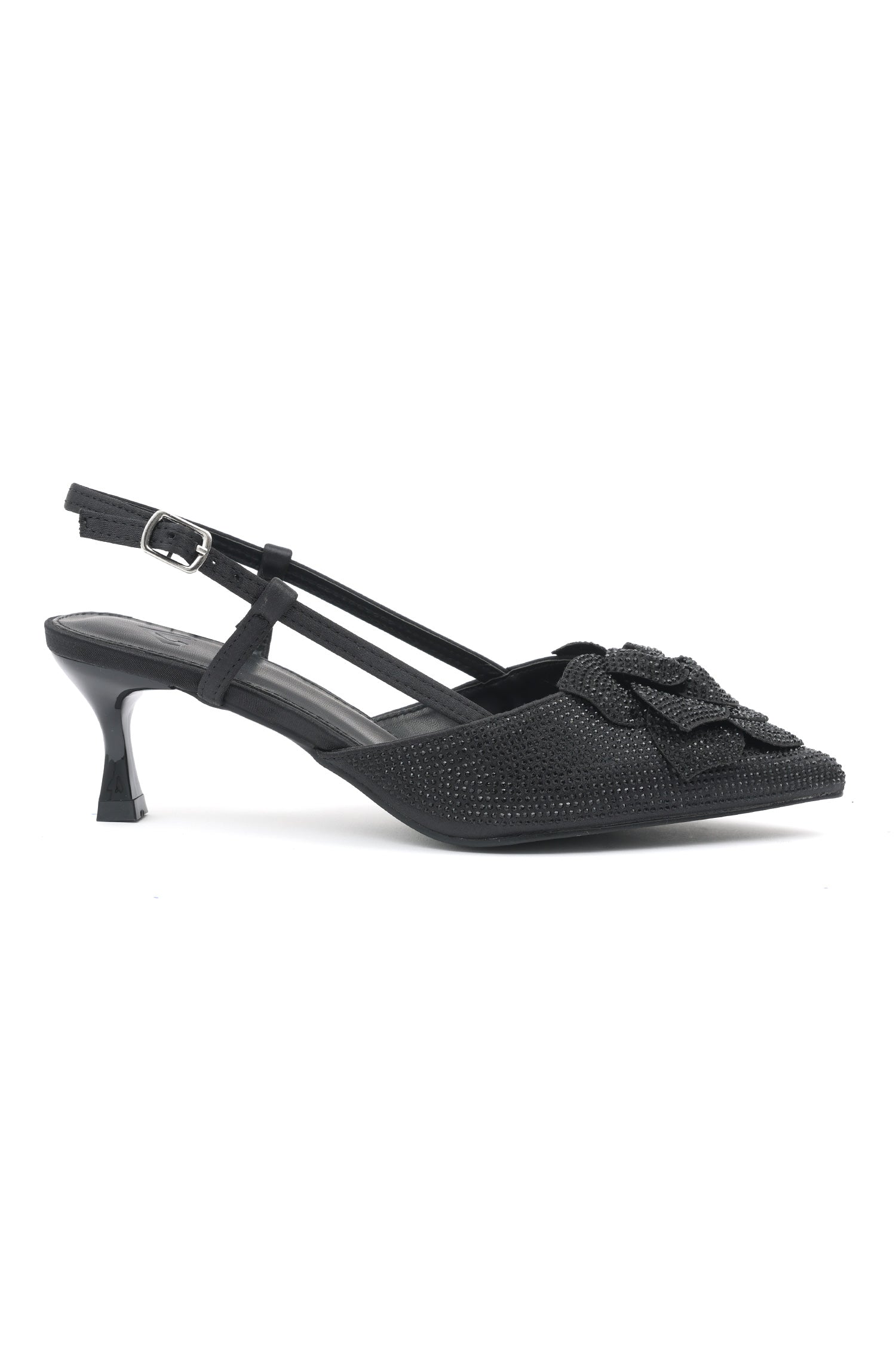 Step out in style with these elegant pointed toe slingback heels. Crafted from premium faux leather, these heels feature a chic T-strap design with adjustable buckles for a customized fit. The pointed toe adds a sophisticated touch, while the embellished floral bow and stud detailing offer a touch of glamour. Set on a comfortable kitten heel, these shoes provide both style and support, making them perfect for any special occasion or a night out.