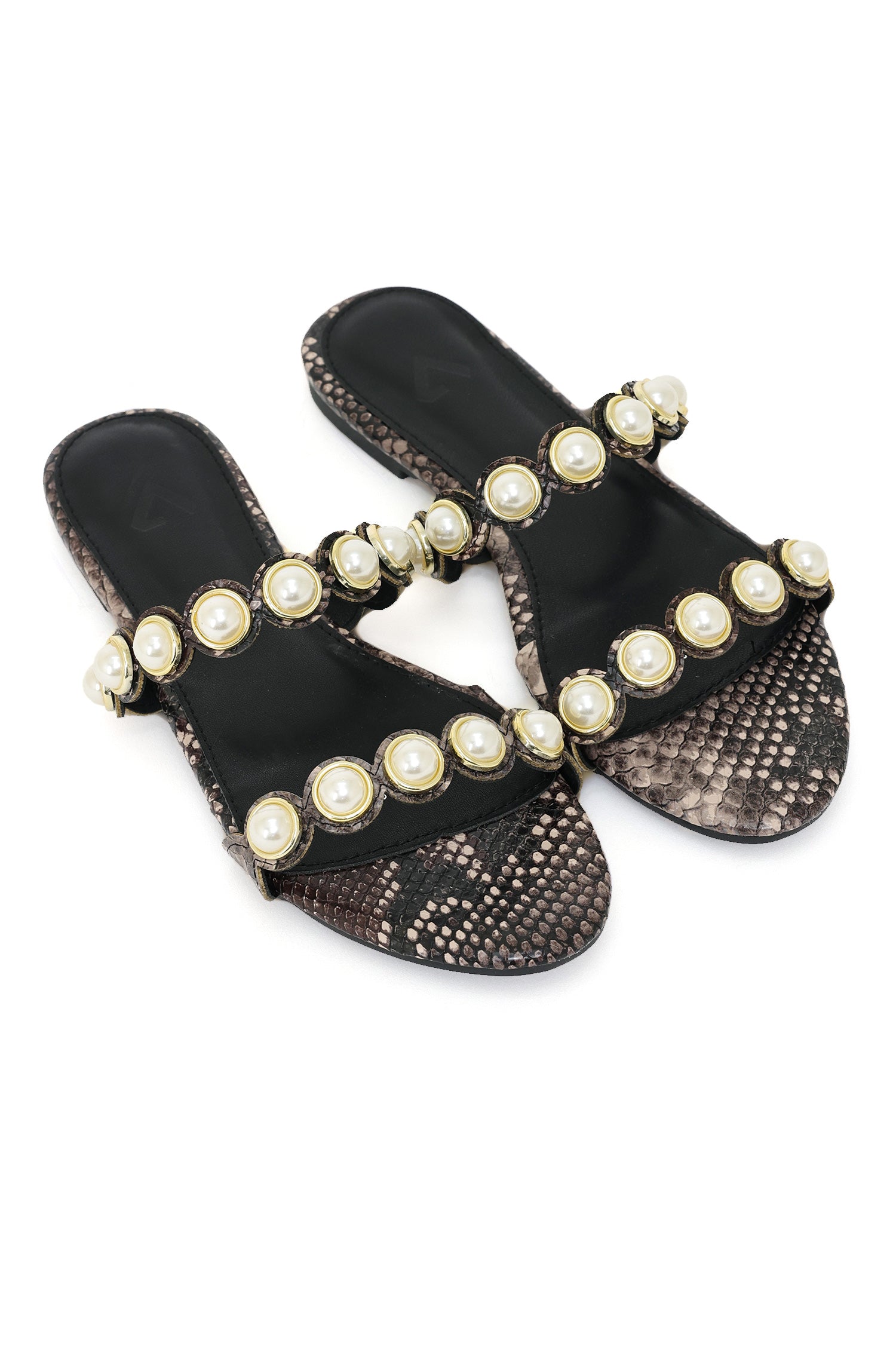 Turn heads with these statement pearl-embellished slides, wrapped in a chic python-textured base. Designed for comfort with a luxe twist, they’re your perfect blend of wild elegance and timeless glam.