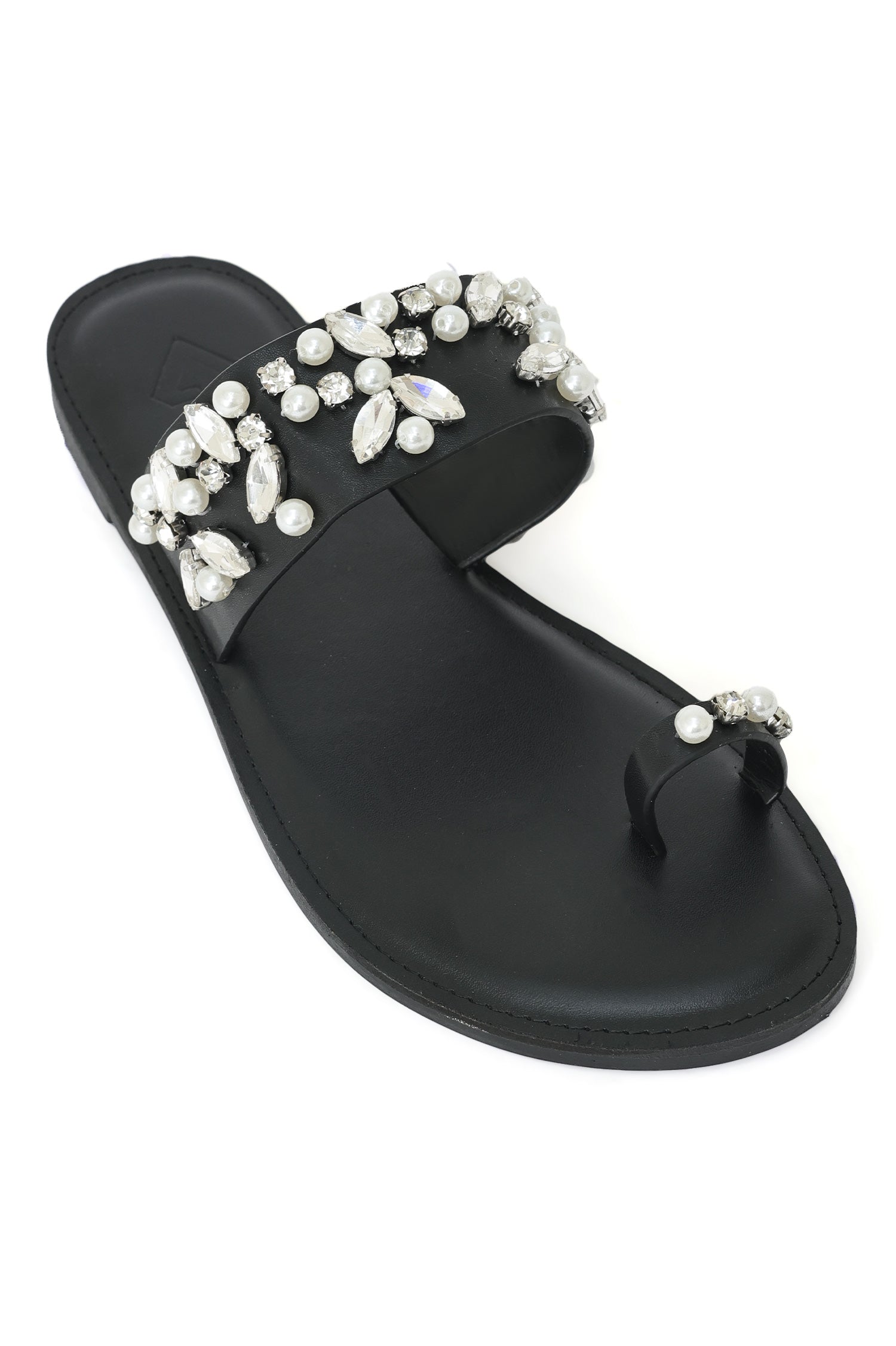 Slip into elegance with this handcrafted flat, embellished with luminous pearls and dazzling stones. The luxe detailing and comfortable toe loop offer a perfect blend of charm and wear ability, making it ideal for festive evenings or upscale casuals.
