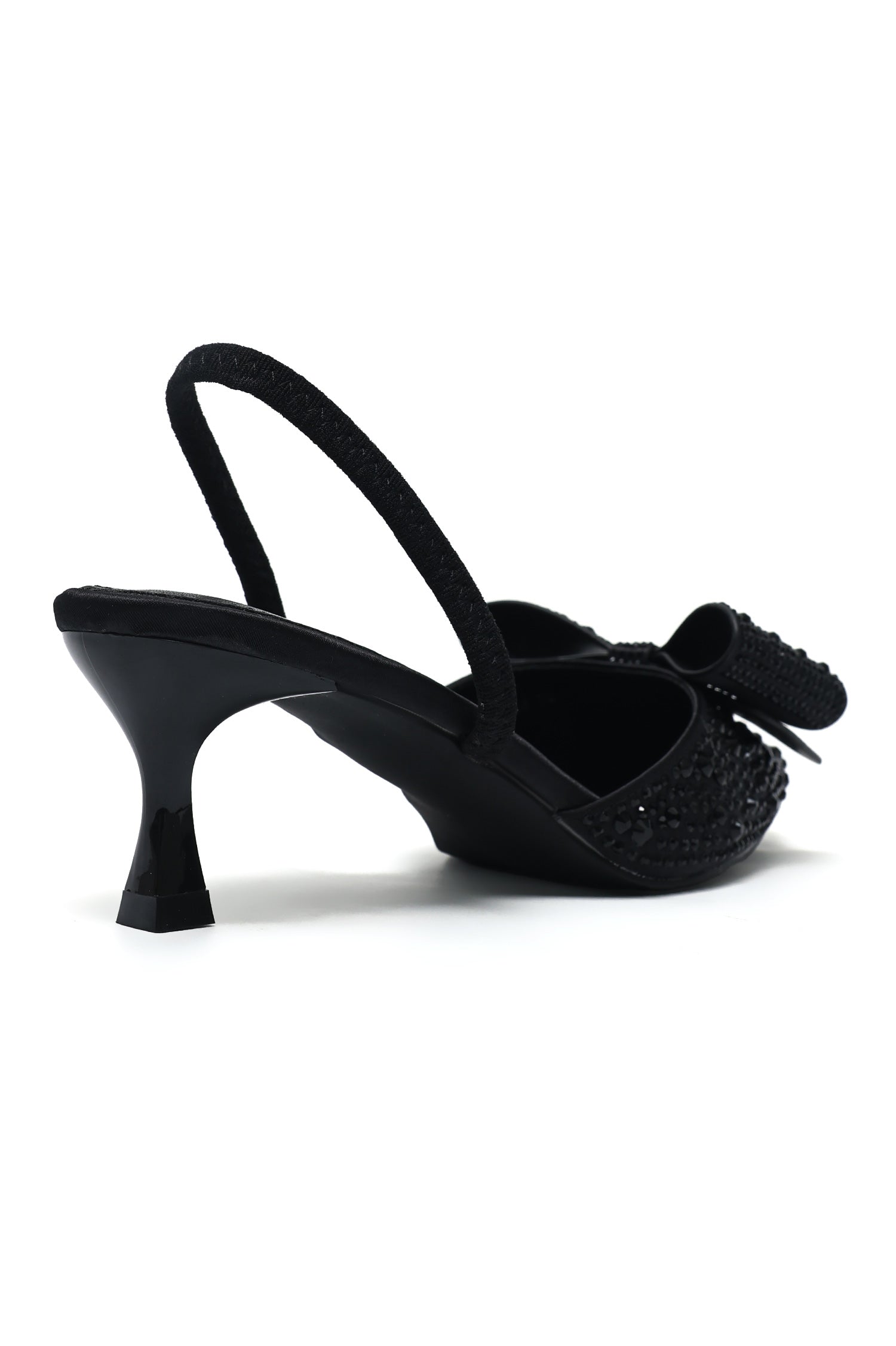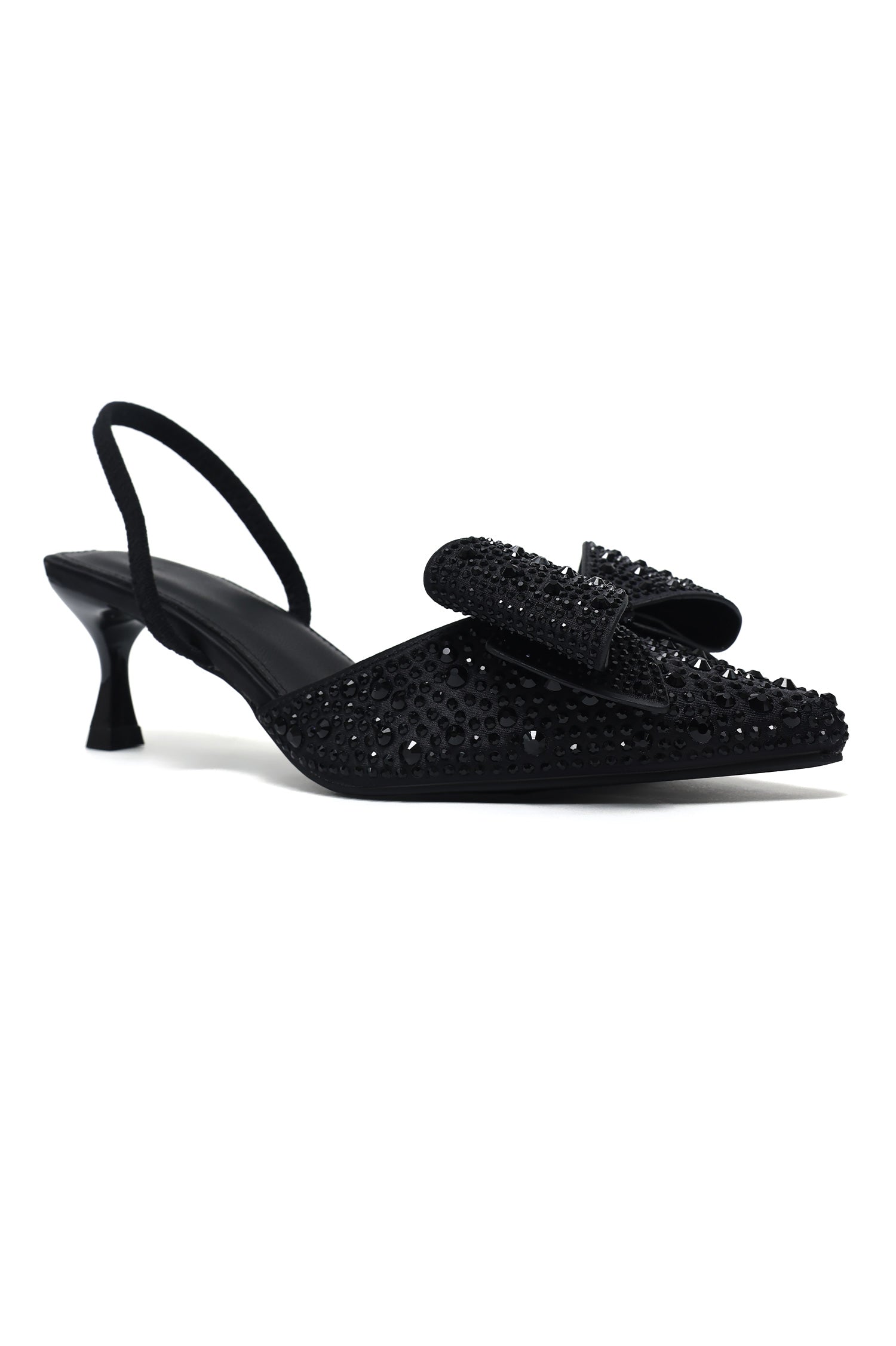 A statement kitten heel adorned with dazzling crystal embellishments and an elegant bow detail. Designed with a pointed toe and a secure sling back strap, this refined silhouette adds a touch of glamour to any ensemble.
