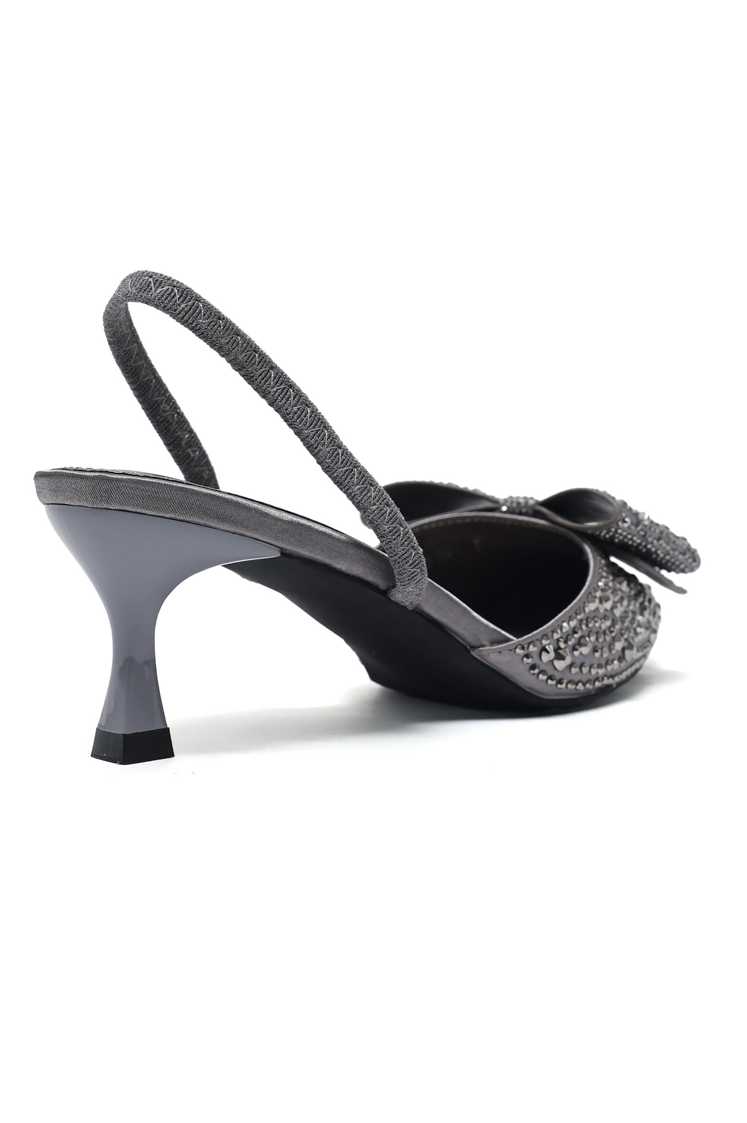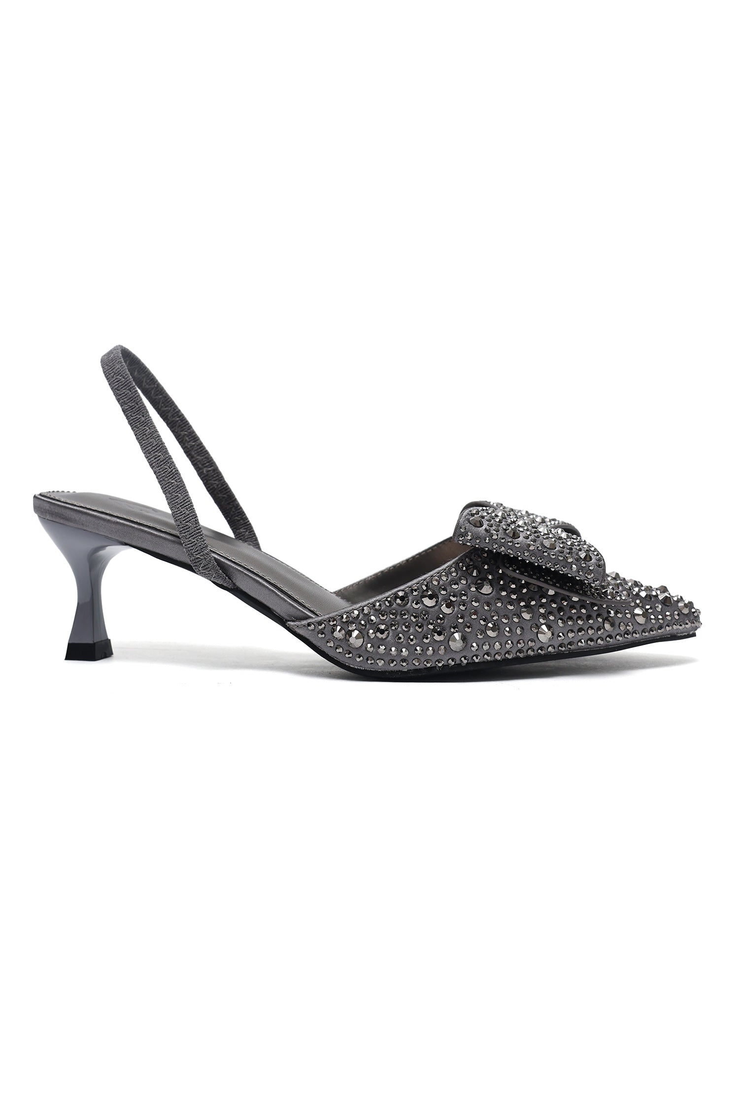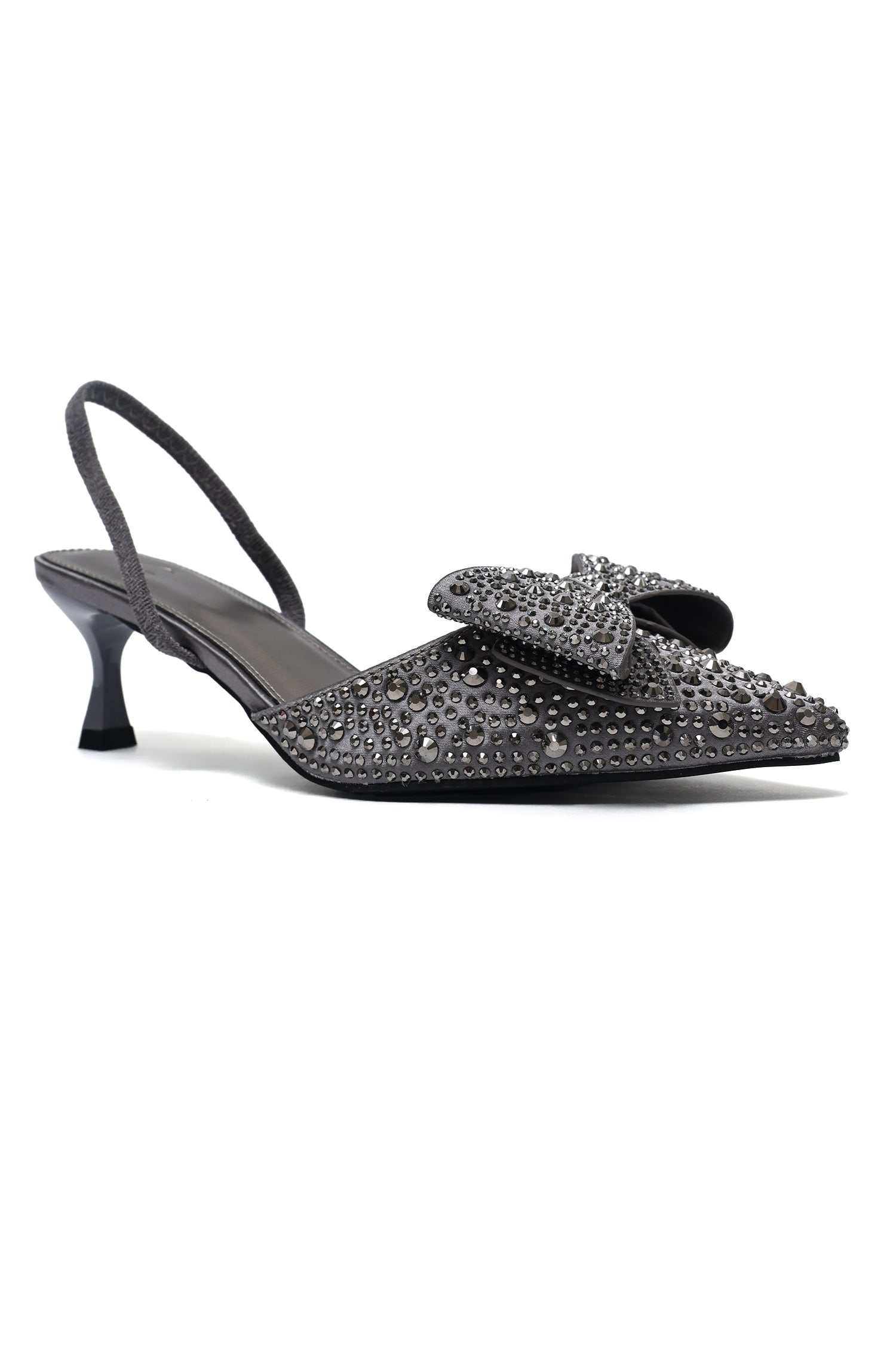 A statement kitten heel adorned with dazzling crystal embellishments and an elegant bow detail. Designed with a pointed toe and a secure sling back strap, this refined silhouette adds a touch of glamour to any ensemble.
