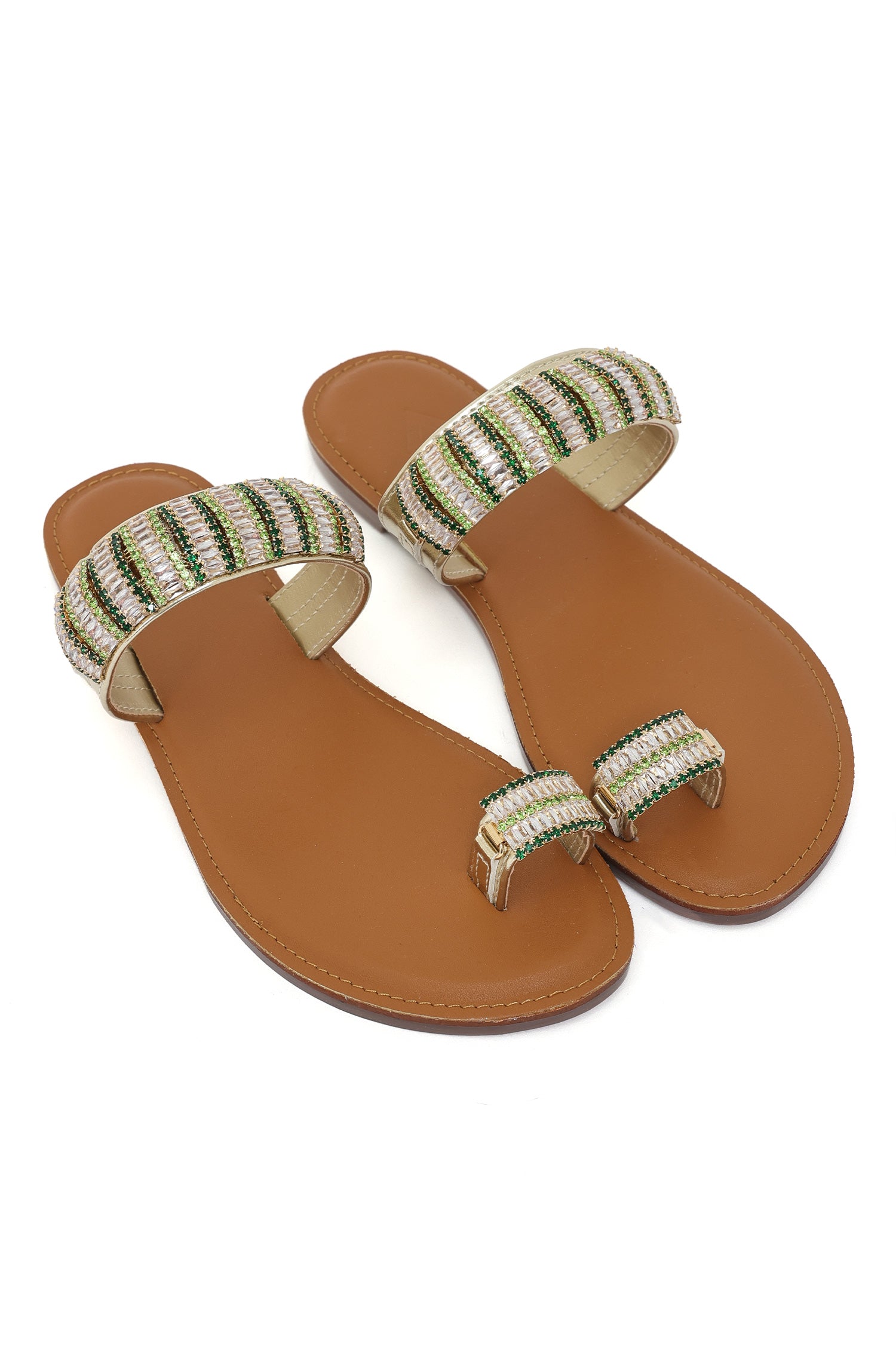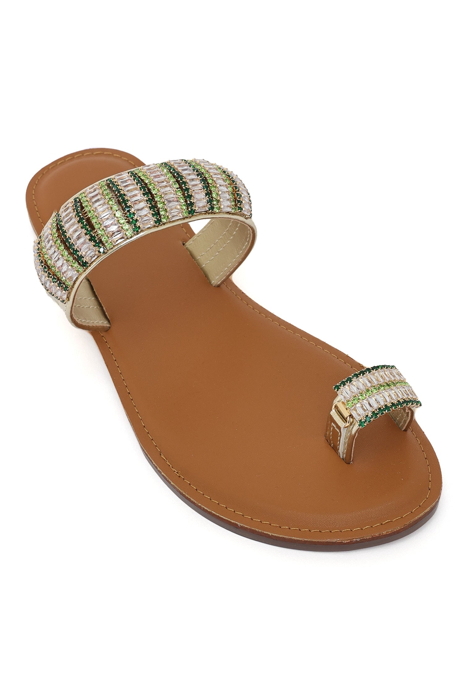 Dazzle in every step with this handcrafted flat featuring radiant gem-striped bands. The structured toe loop ensures a secure fit, while the luxe embellishments add a festive flair—perfect for effortless glam on any occasion.