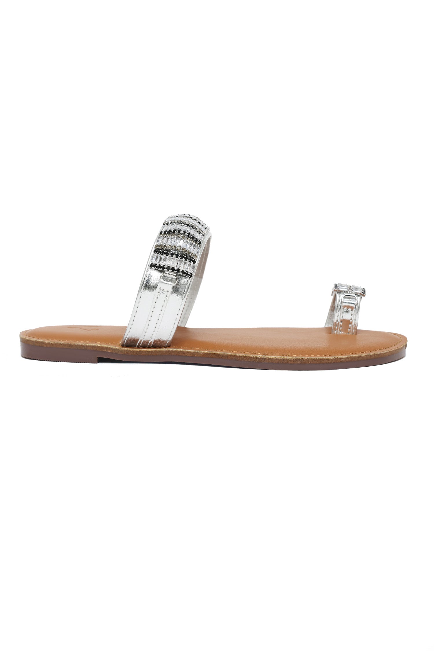 These embellished toe-ring flats offer a refined look with intricate detailing. The dual-strap design ensures a secure fit, while the cushioned sole provides effortless wear. Perfect for adding a touch of glamour to casual or festive ensembles.
