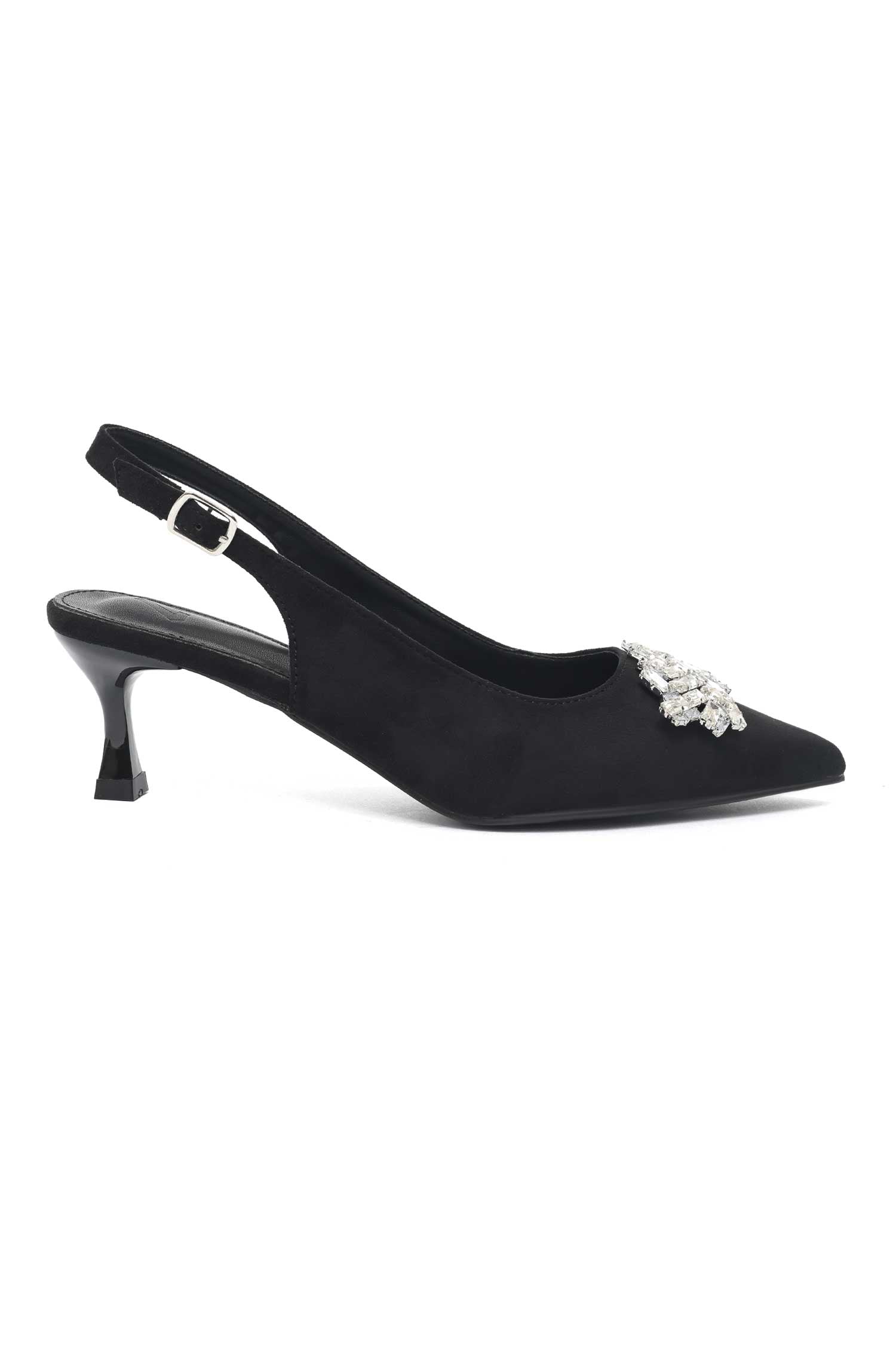 This satin kitten heel radiates luxury with a sculpted crystal bow. The sharp pointed toe and soft slingback strap add vintage drama with a modern twist. A standout pair for evening soirees.