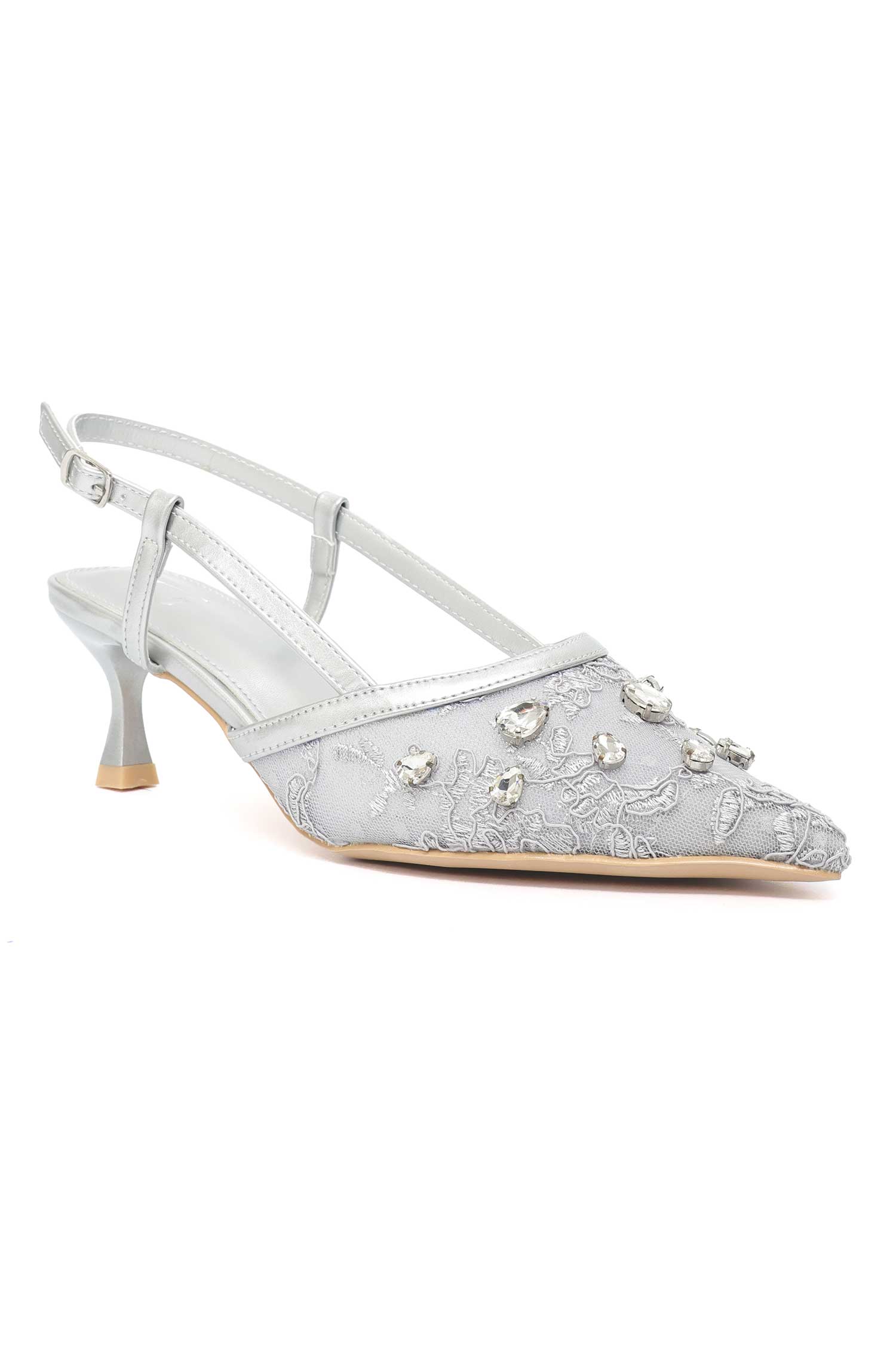 Ethereal and detailed, this heel features embroidered floral motifs with scattered crystals, exuding elegance. The soft sheen fabric and sculpted heel blend minimalism with embellishment. A poetic choice for timeless style.
