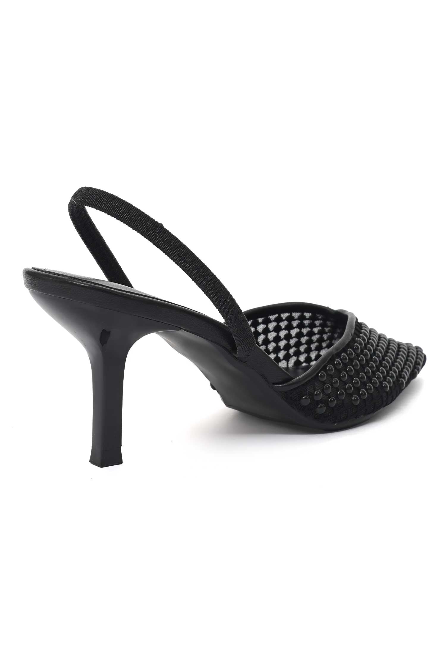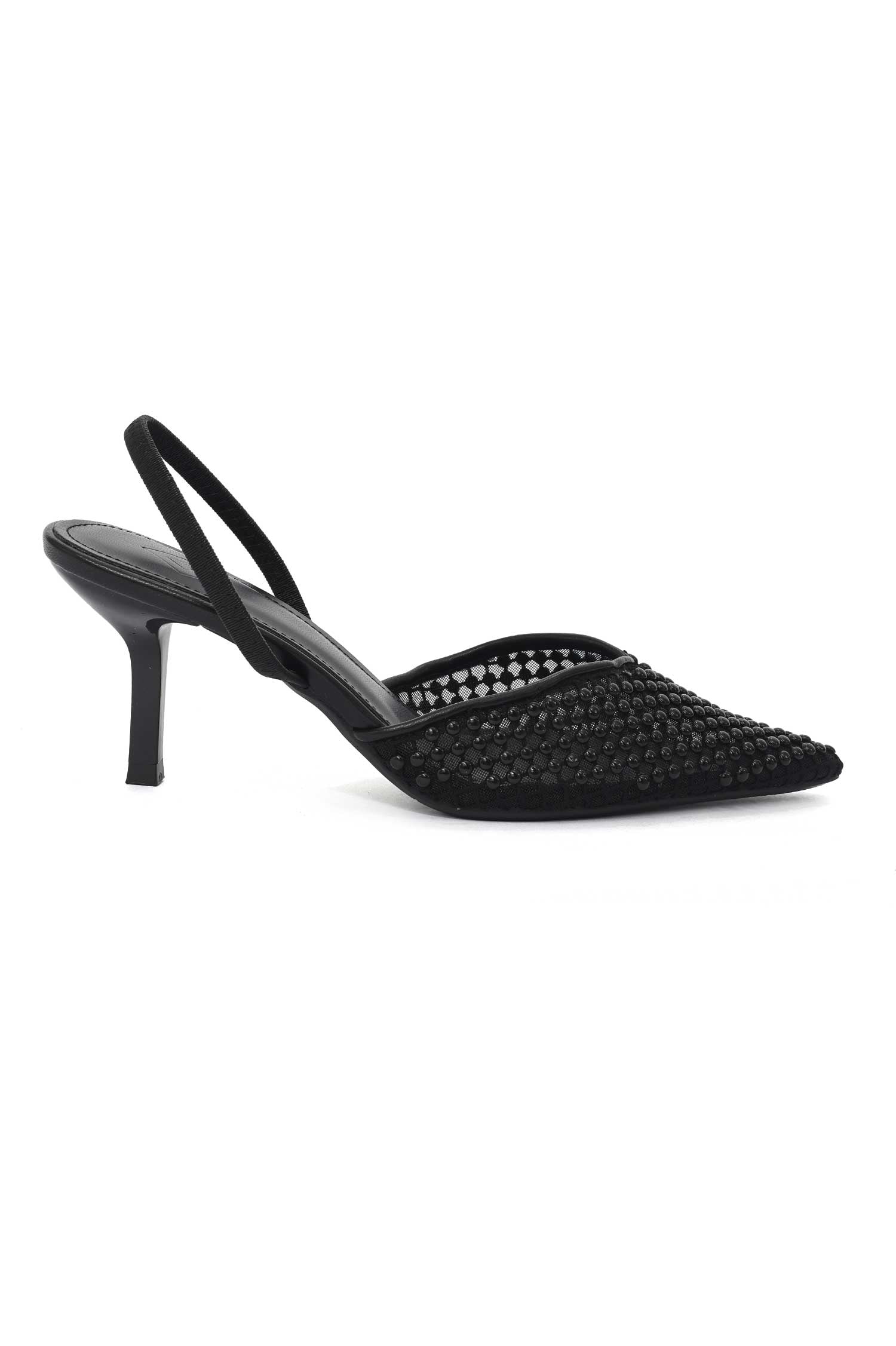 Sheer mesh creates a soft contrast to the dramatic embellishment.