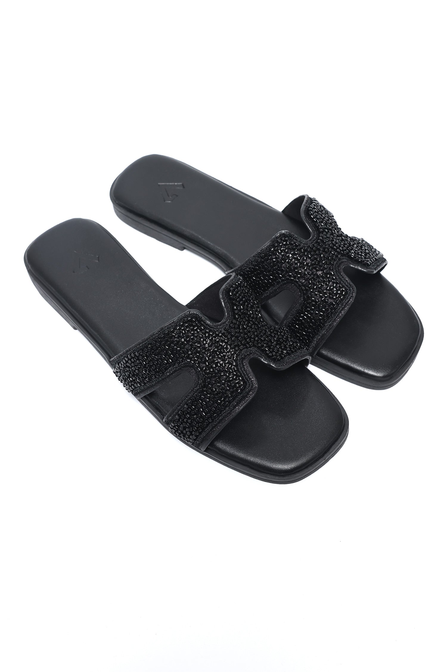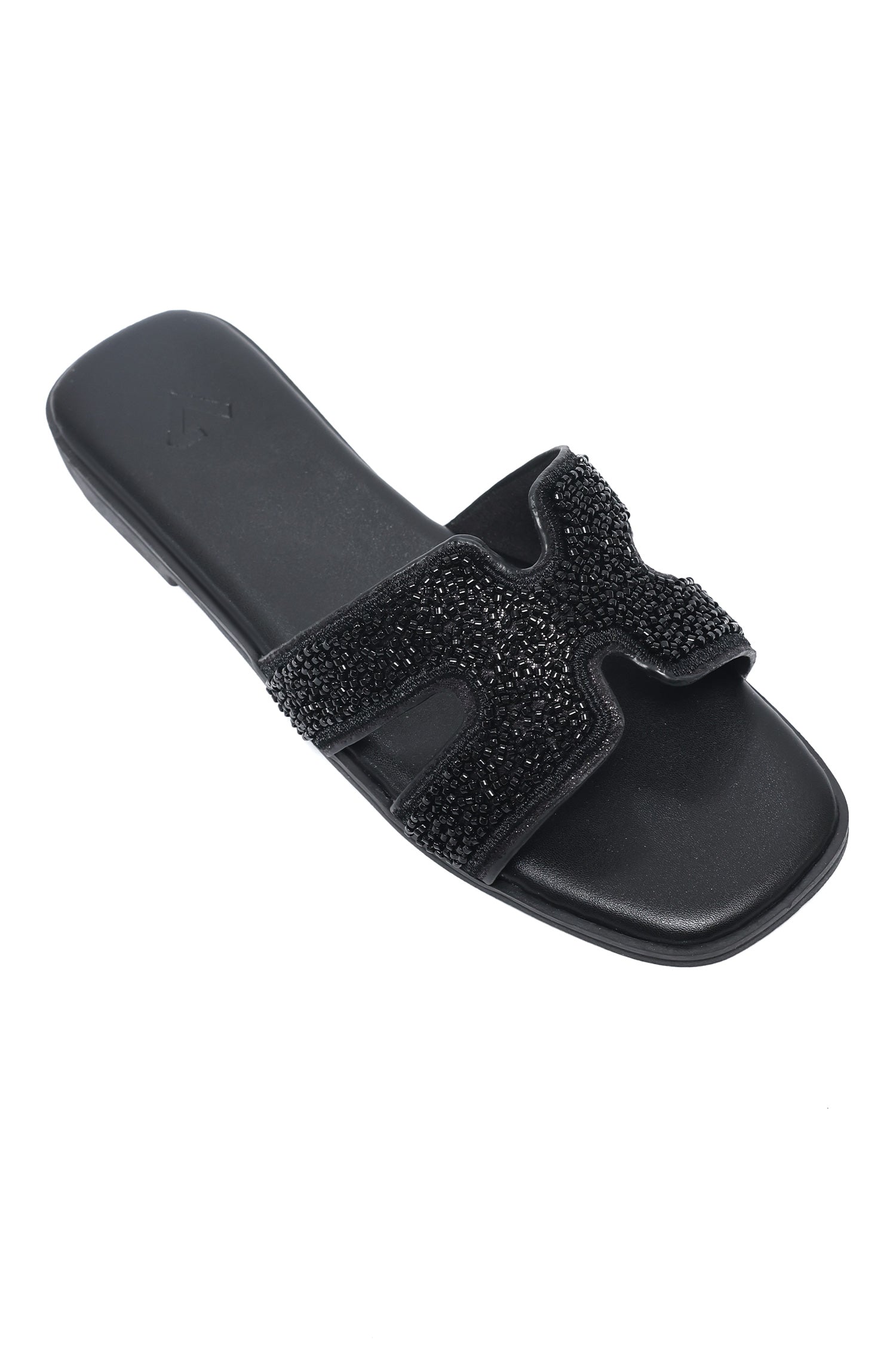 A distinguished mule featuring a decorative cut panel with detailed embellishment.