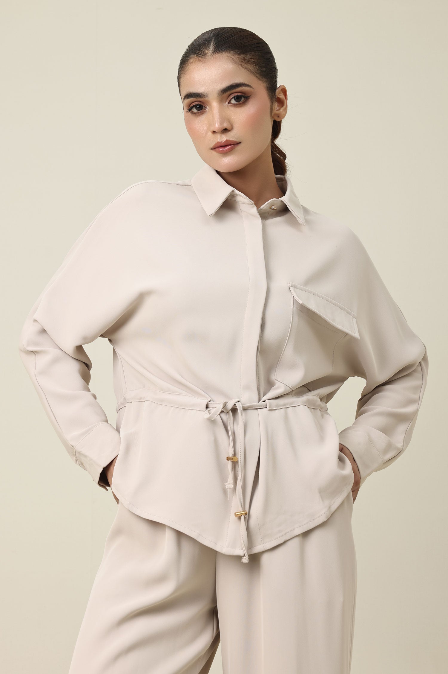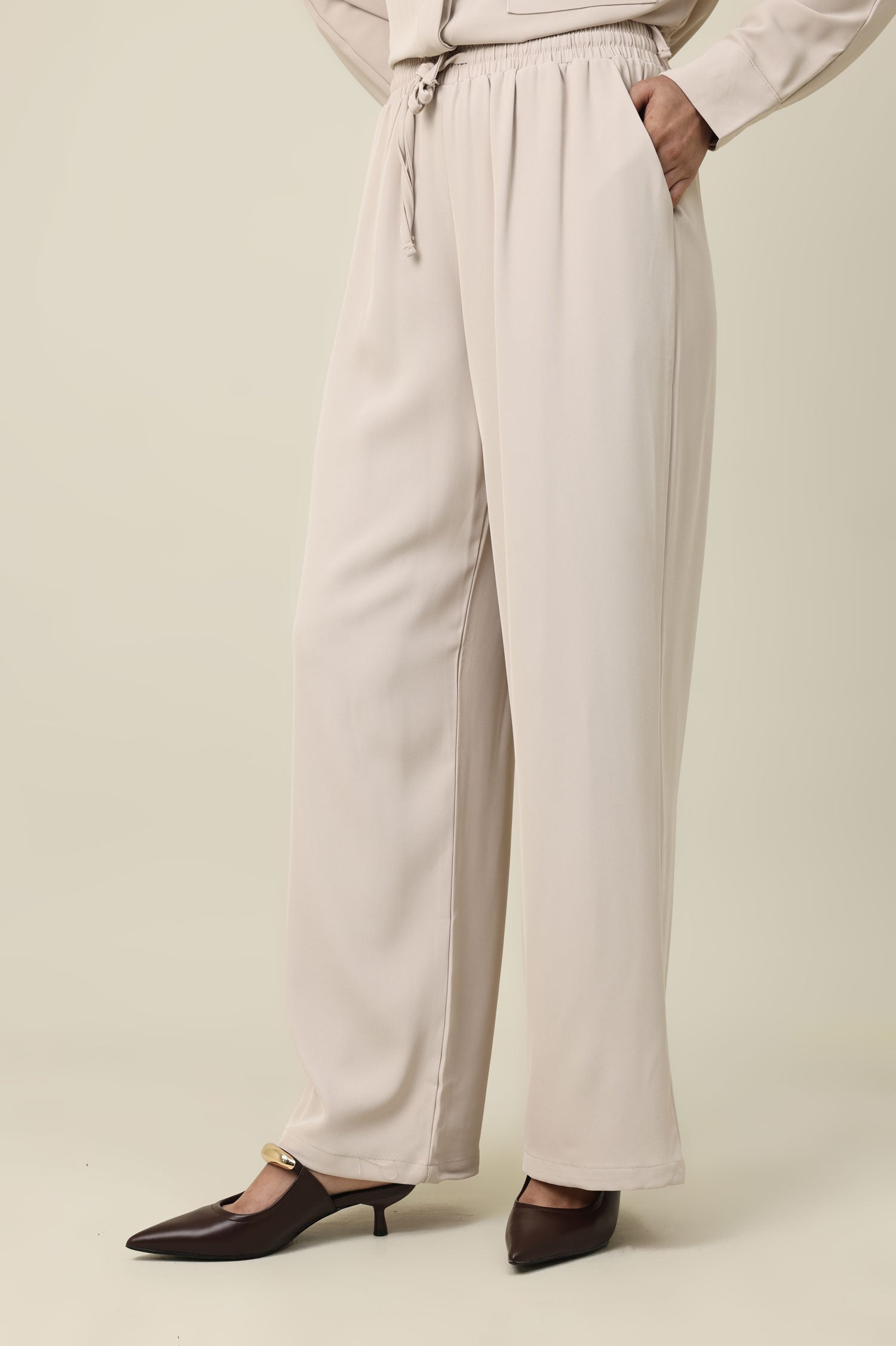 Combining ease with refinement, the drawstring waistline gently contours the silhouette. Paired with a soft-fall trouser for flowing movement. A subtle pocket detail adds quiet functionality.