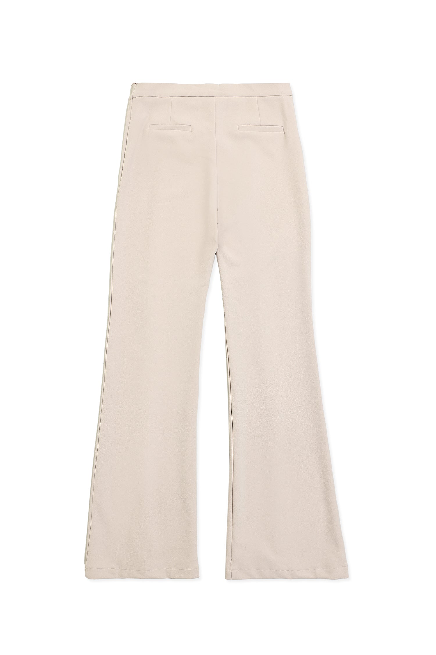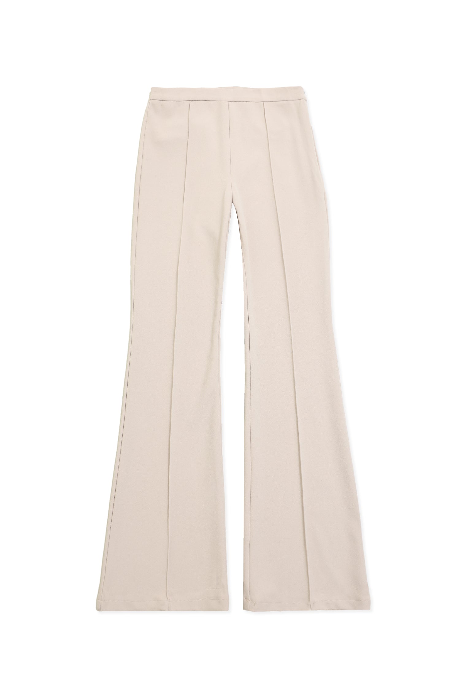 Designed with a smooth, structured surface, this trouser features elongated front seams that refine its silhouette. the soft drape extends into a gentle flare, creating a streamlined yet relaxed fall. its tailored waistband and minimal detailing enhance the clean, contoured look, offering a polished shape ideal for modern, versatile styling.
