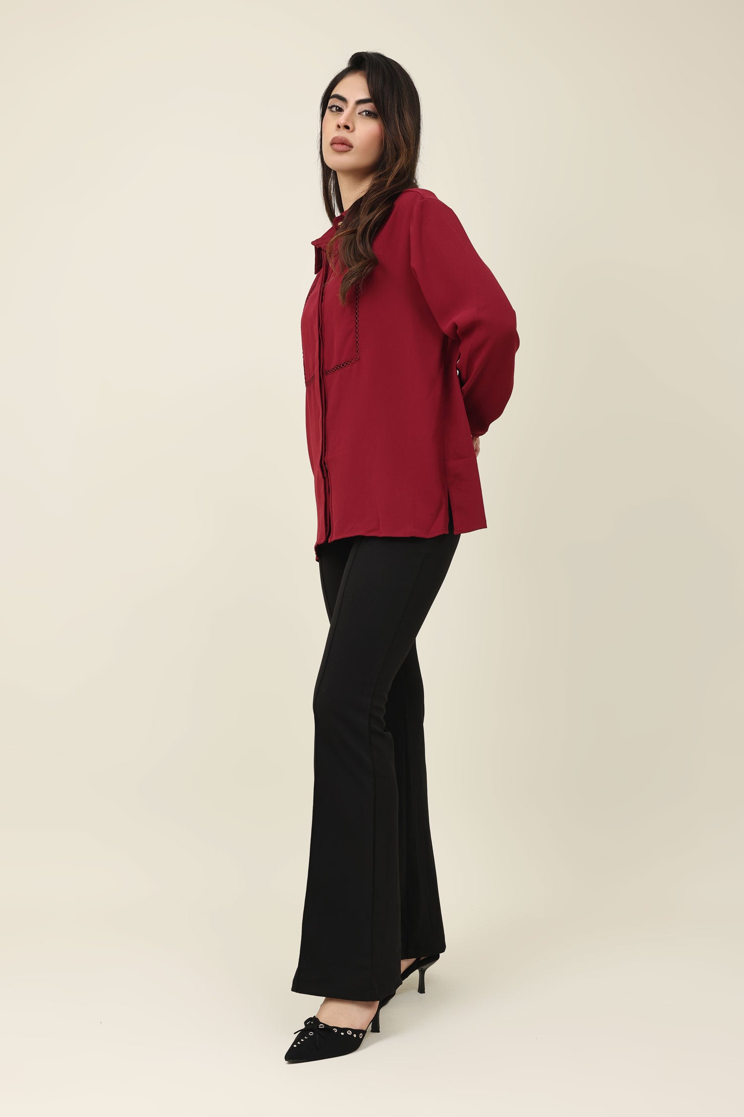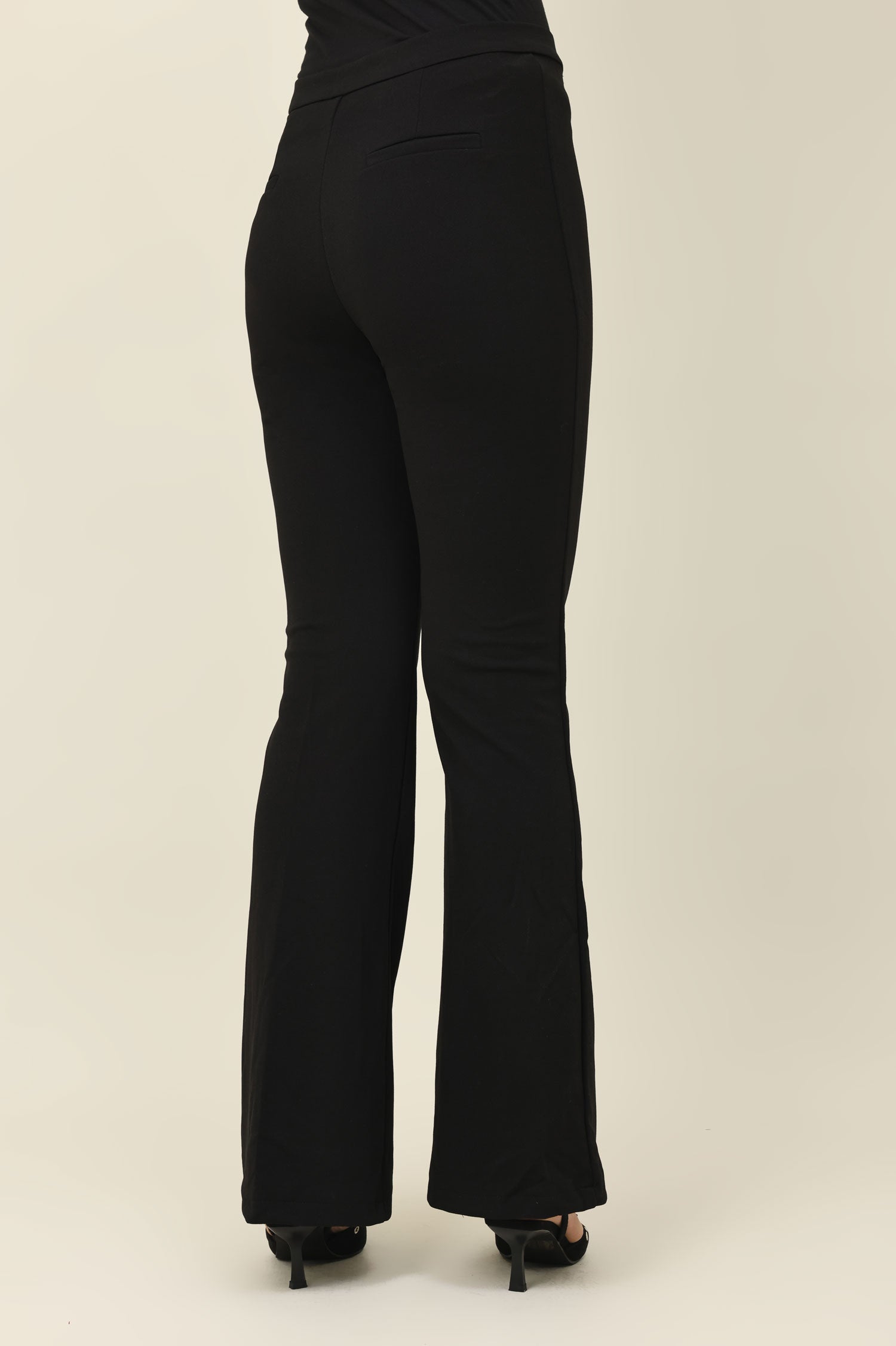 Designed with a smooth, structured surface, this trouser features elongated front seams that refine its silhouette. the soft drape extends into a gentle flare, creating a streamlined yet relaxed fall. its tailored waistband and minimal detailing enhance the clean, contoured look, offering a polished shape ideal for modern, versatile styling.