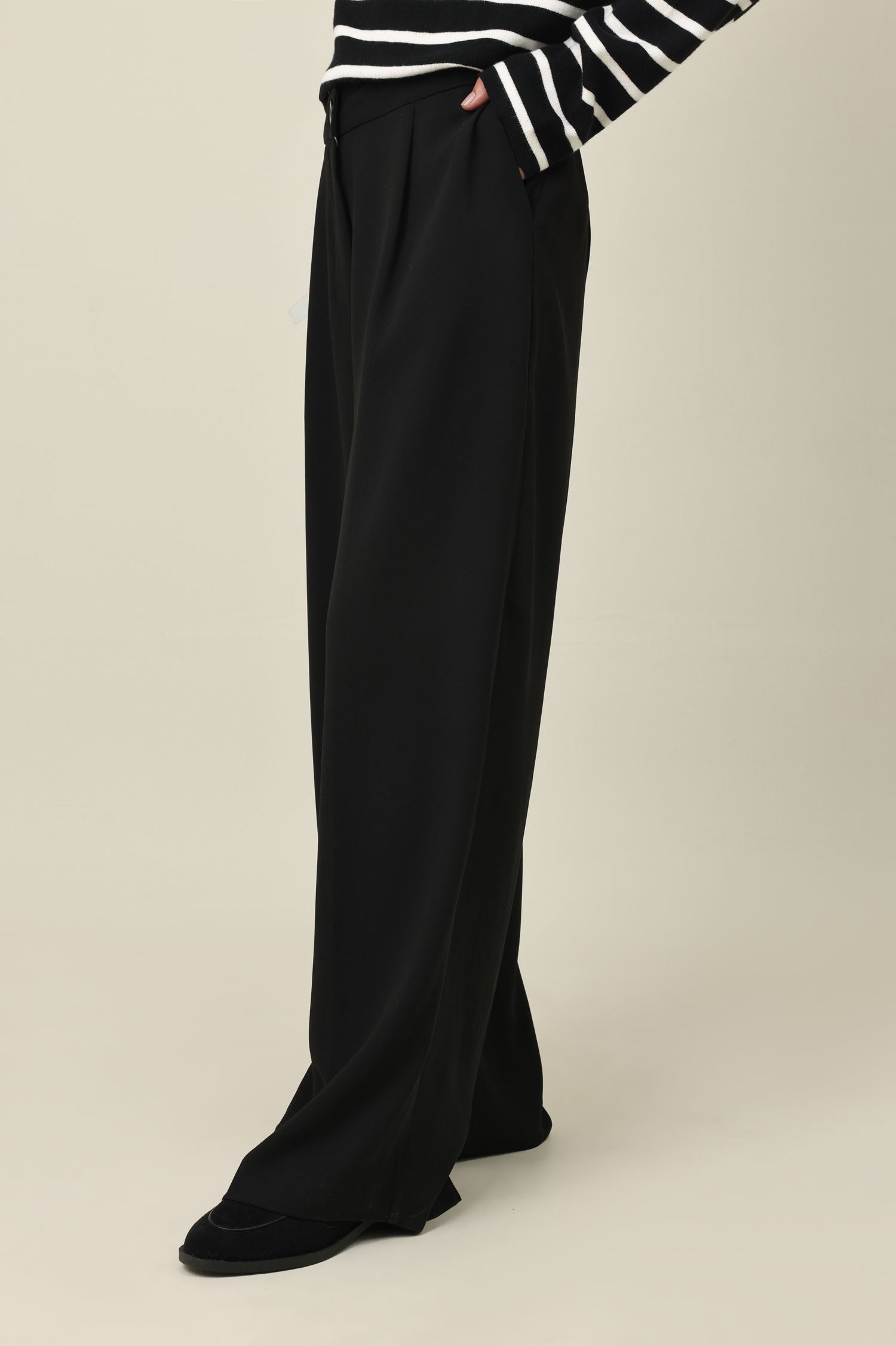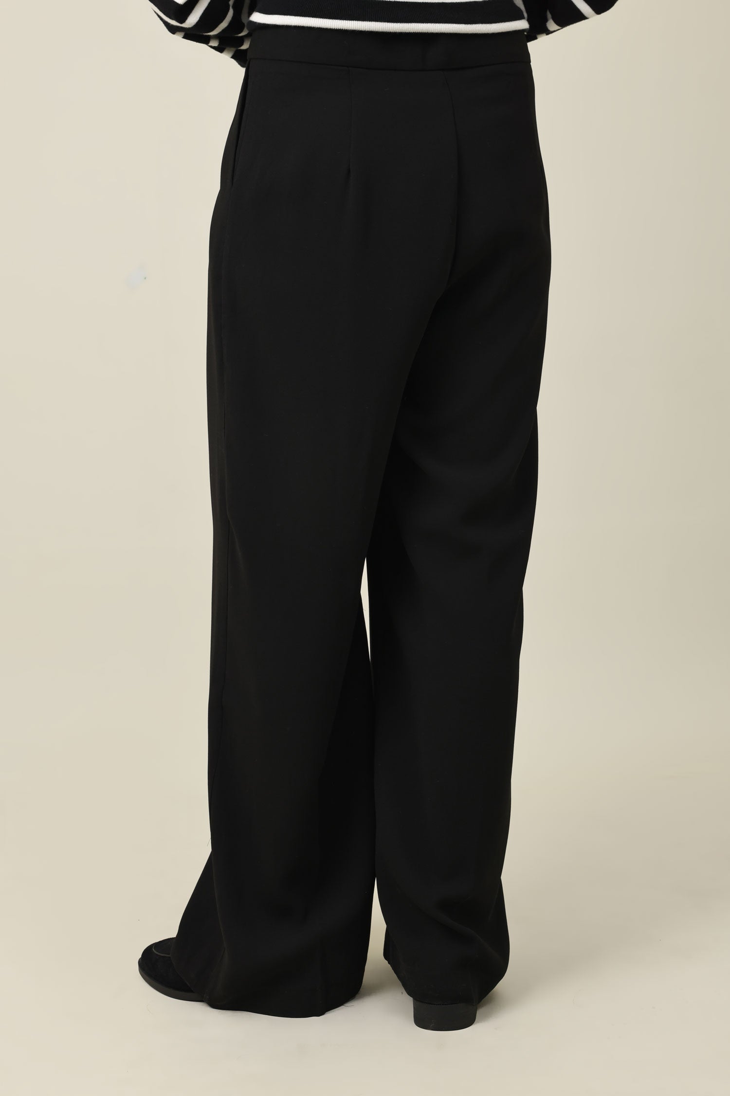 A modern cut meets classic tailoring in this relaxed-leg pant with clean front pleats. The fabric drapes smoothly from the hip for a sophisticated, elongated look. Perfect for desk-to-dinner transitions.