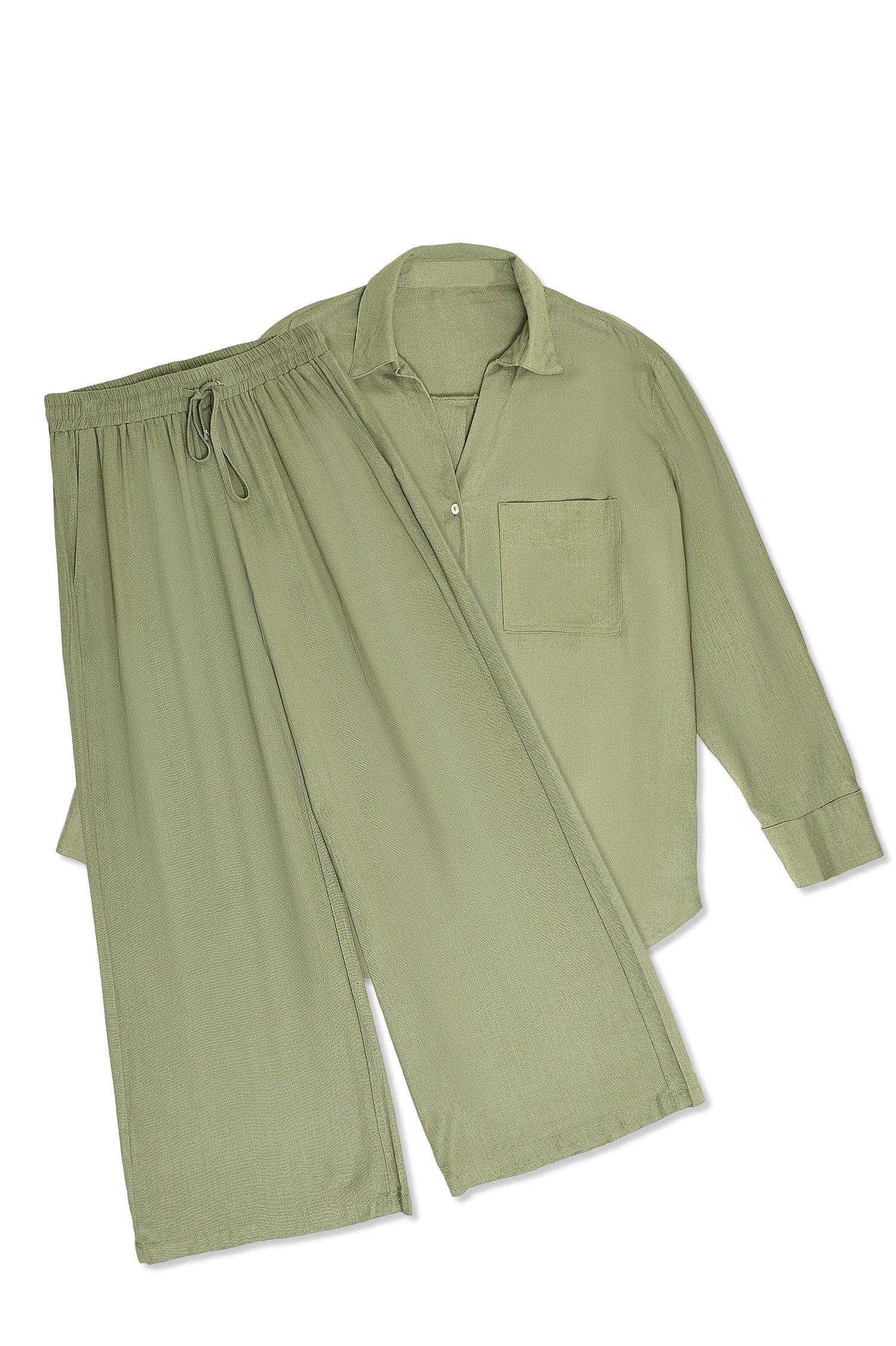 This duo reimagines leisurewear with flowing lines and a soft-crushed texture. Featuring a drop-shoulder shirt and high-waisted pants with an airy drape. The relaxed cut ensures freedom of movement while retaining a refined finish. Ideal for travel, lounging, or casual city errands.
