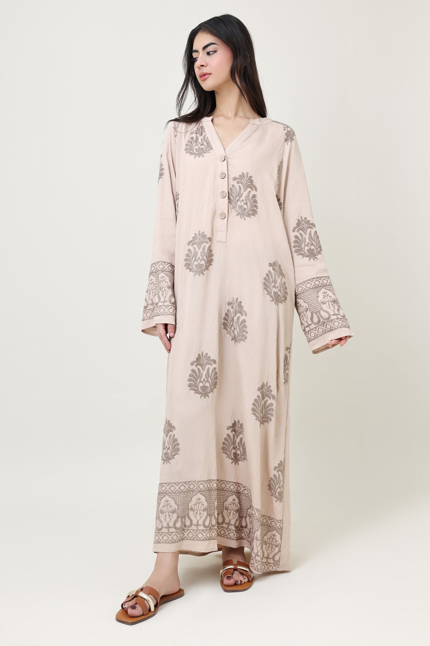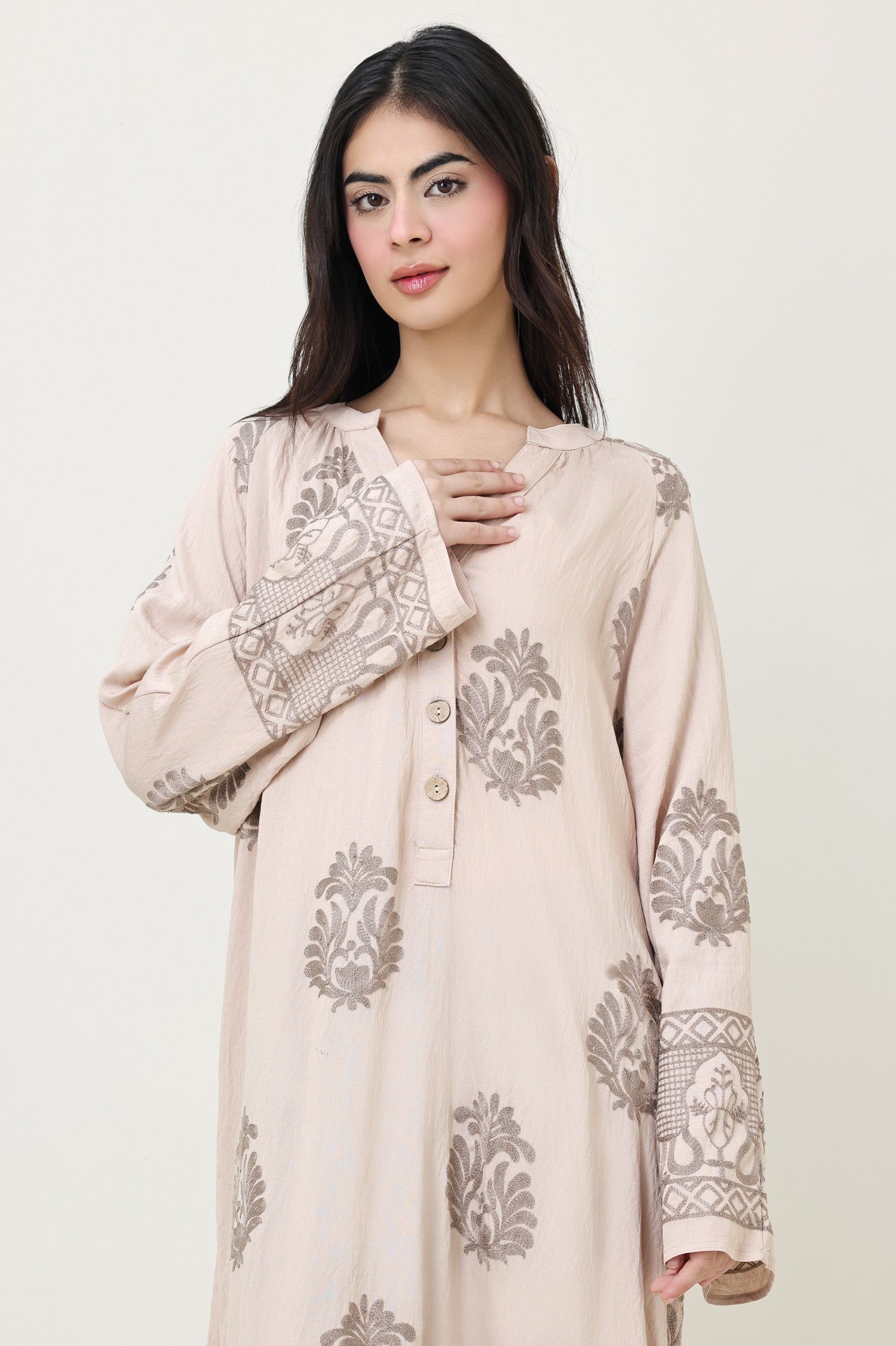 Infused with vintage charm, this dress showcases elegant jacquard-inspired motifs and a rich embroidered border. The soft, breathable fabric and relaxed silhouette offer all-day comfort with timeless sophistication.
