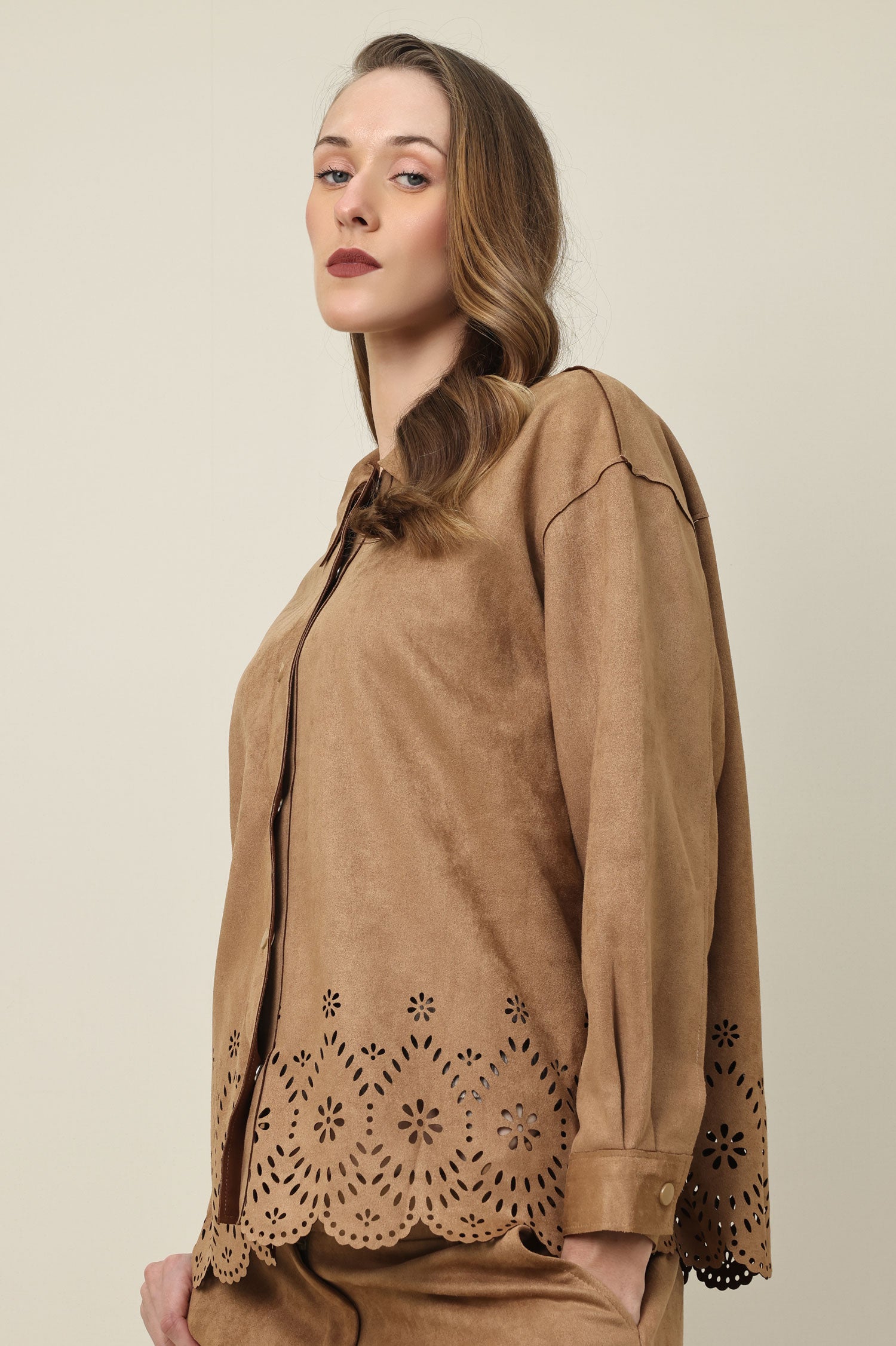 Intricate cutwork blooms along the hemline of this soft-touch button-up. The curved scallop border adds a graceful touch, blending modern tailoring with artisanal finesse. A quiet statement in structured fluidity.