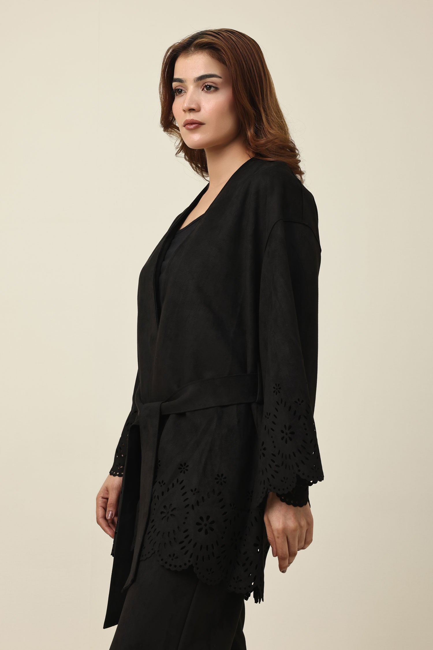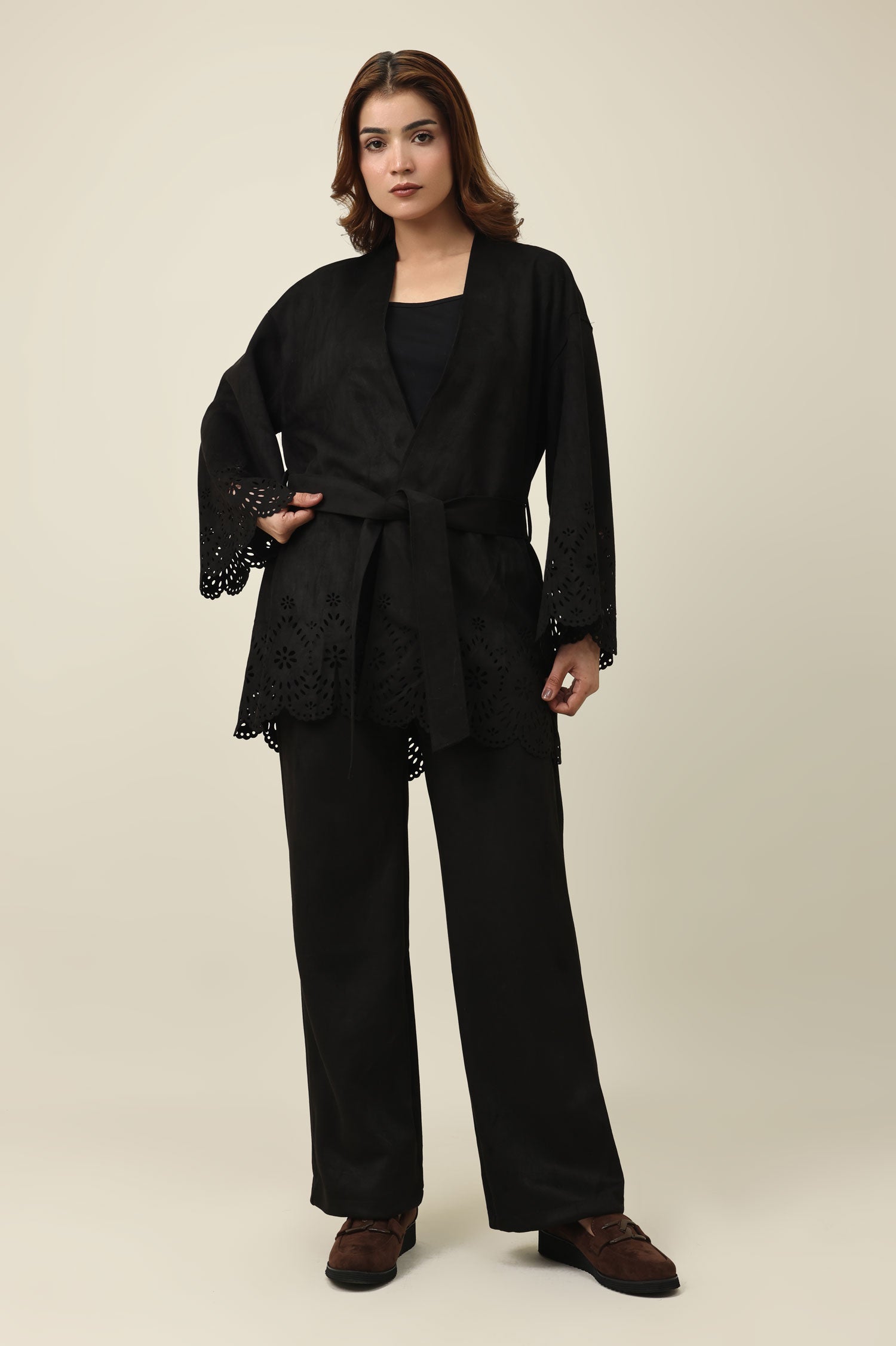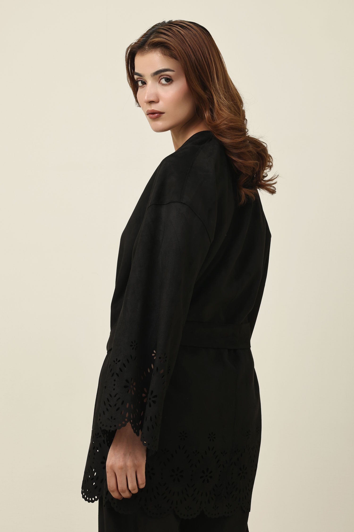 ELEGANCE LASER CUT BELTED SHIRT-BLACK