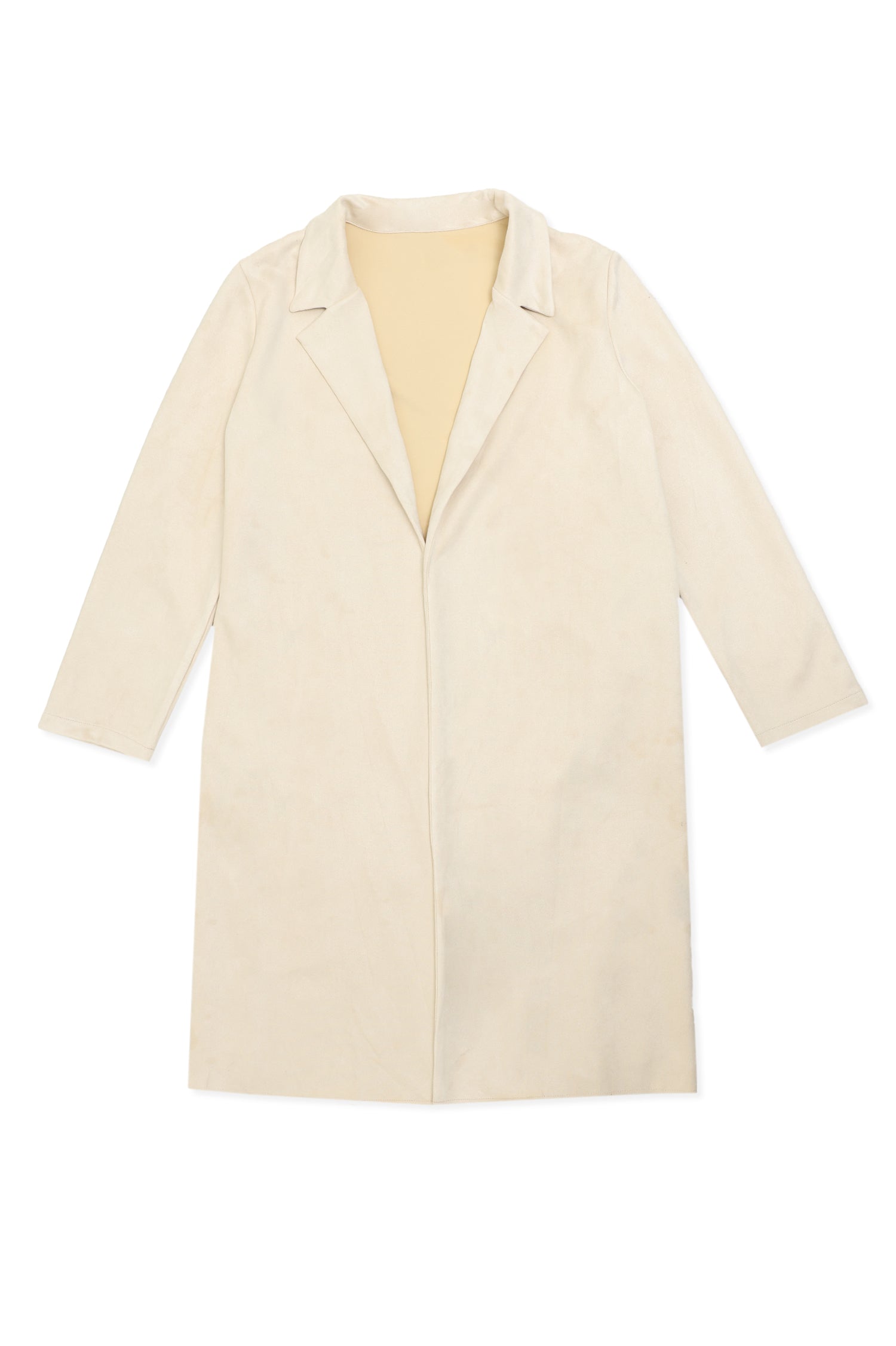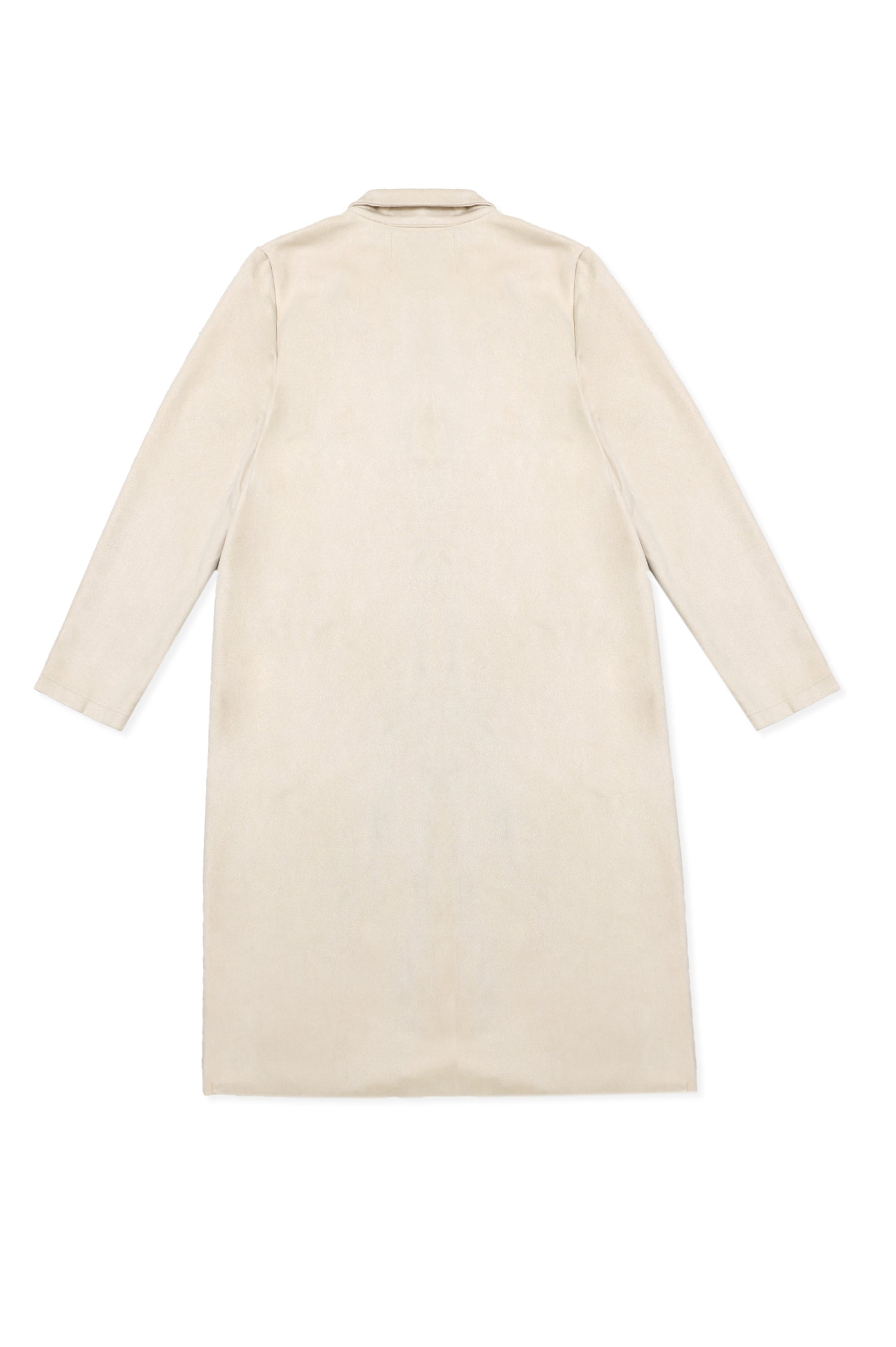 Tailored in a brushed suede-like texture, this long coat delivers a refined yet relaxed silhouette. Features a soft structure with notched lapels and an open front drape. A sophisticated layering piece that flows effortlessly with clean-cut edges.