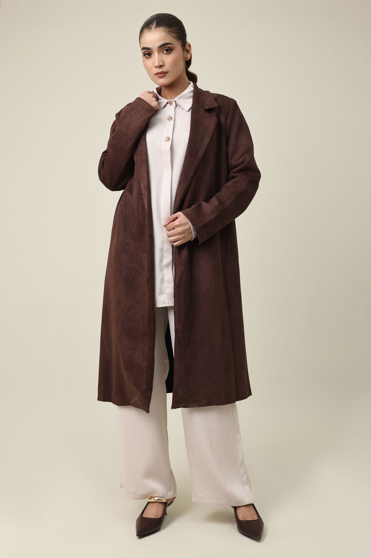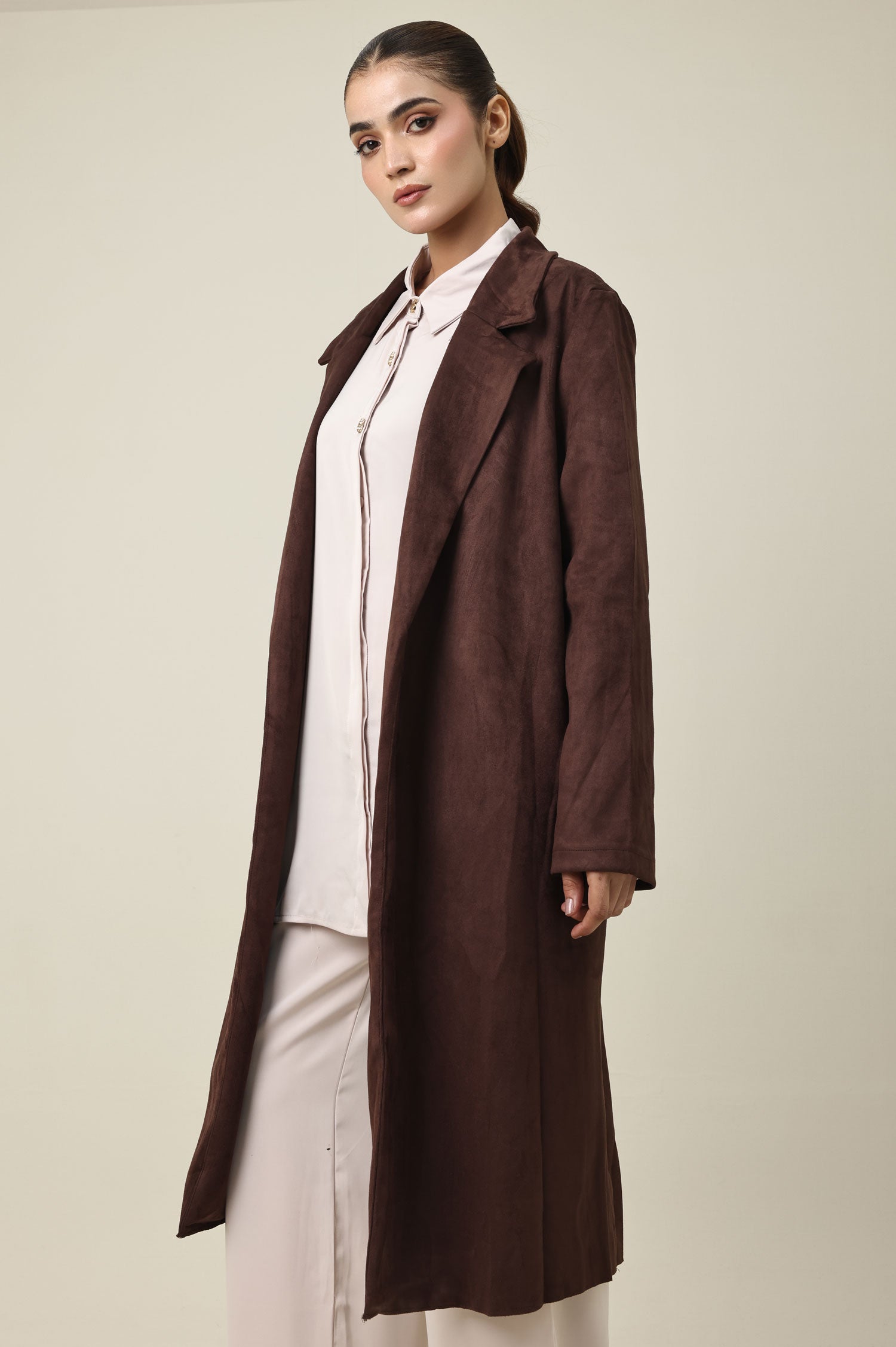 Tailored in a brushed suede-like texture, this long coat delivers a refined yet relaxed silhouette. Features a soft structure with notched lapels and an open front drape. A sophisticated layering piece that flows effortlessly with clean-cut edges.