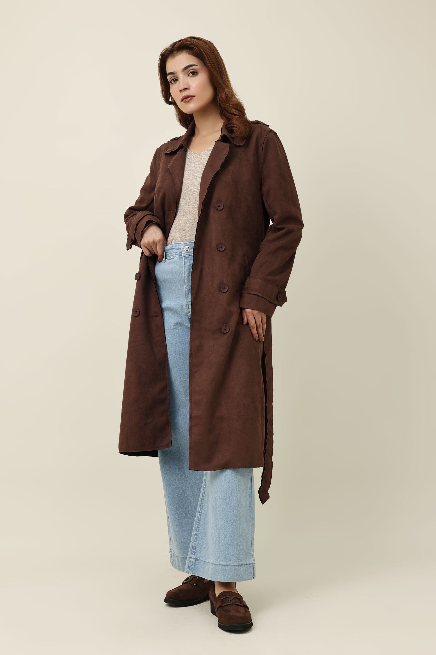 Our take on the most awaited trench coat in a long sleek silhouette designed in faux suede featuring a double breasted lapel collar, welt pockets, epaulettes and a suede belt.