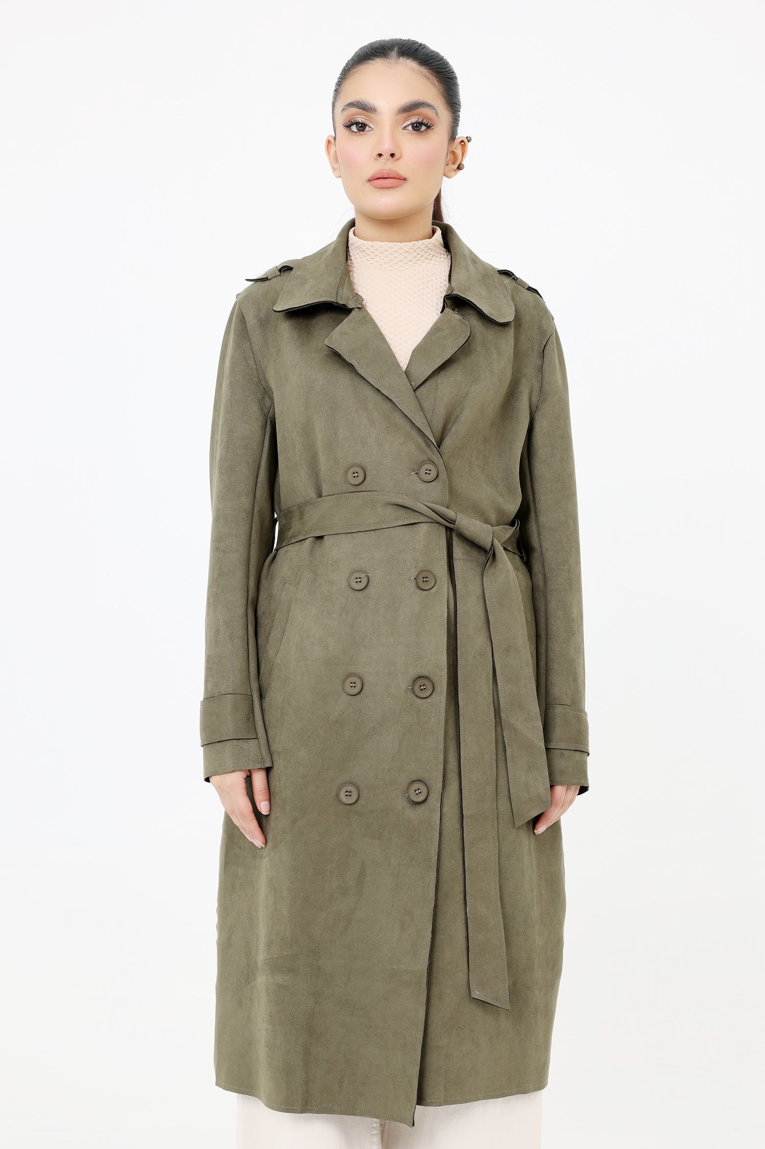 Our take on the most awaited trench coat in a long sleek silhouette designed in faux suede featuring a double breasted lapel collar, welt pockets, epaulettes and a suede belt.