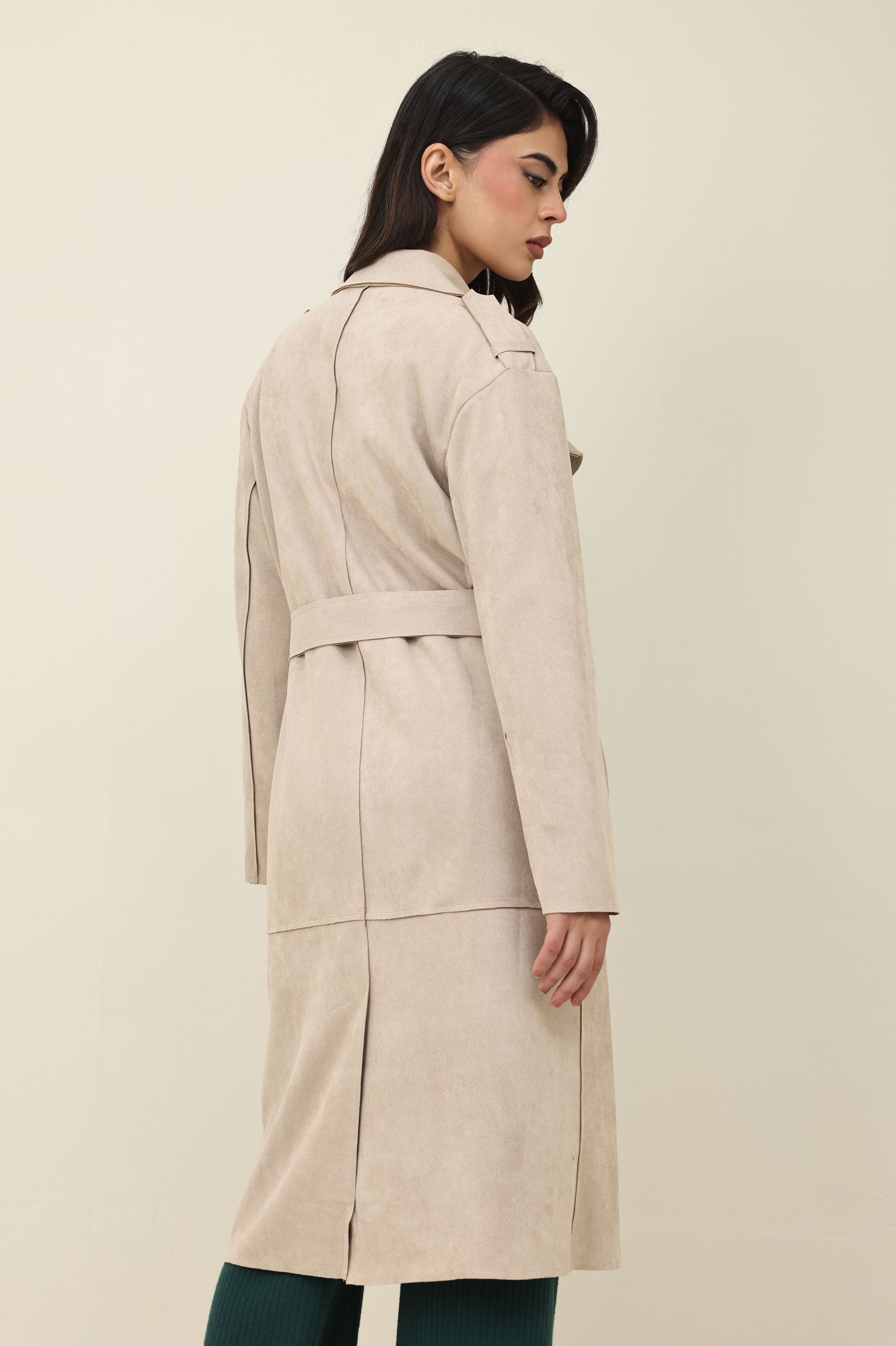 Designed with a soft suede-like texture, this trench coat features a structured double-breasted front that enhances its timeless silhouette. the wide lapels and storm flap add depth and dimension, giving it a classic layered appeal. the belted waist creates a refined, sculpted shape.