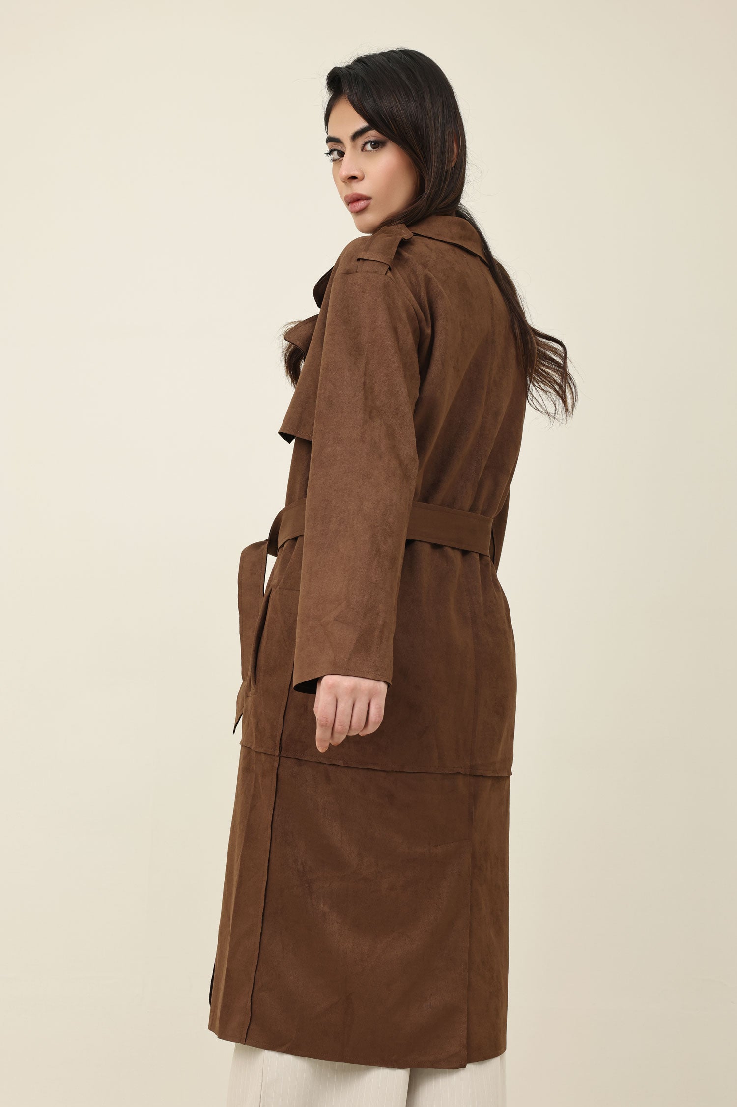 Designed with a soft suede-like texture, this trench coat features a structured double-breasted front that enhances its timeless silhouette. the wide lapels and storm flap add depth and dimension, giving it a classic layered appeal. the belted waist creates a refined, sculpted shape.