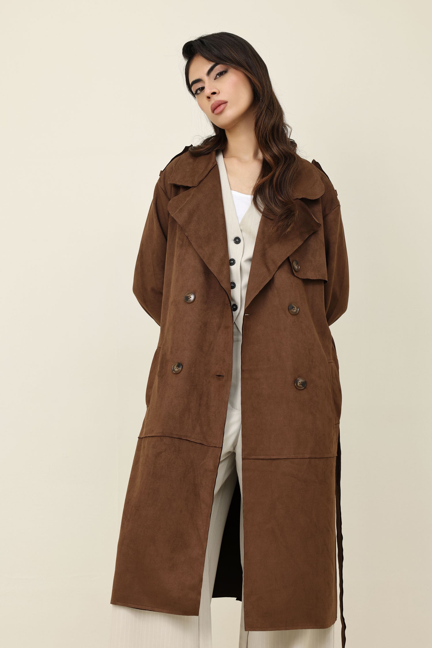 Designed with a soft suede-like texture, this trench coat features a structured double-breasted front that enhances its timeless silhouette. the wide lapels and storm flap add depth and dimension, giving it a classic layered appeal. the belted waist creates a refined, sculpted shape.
