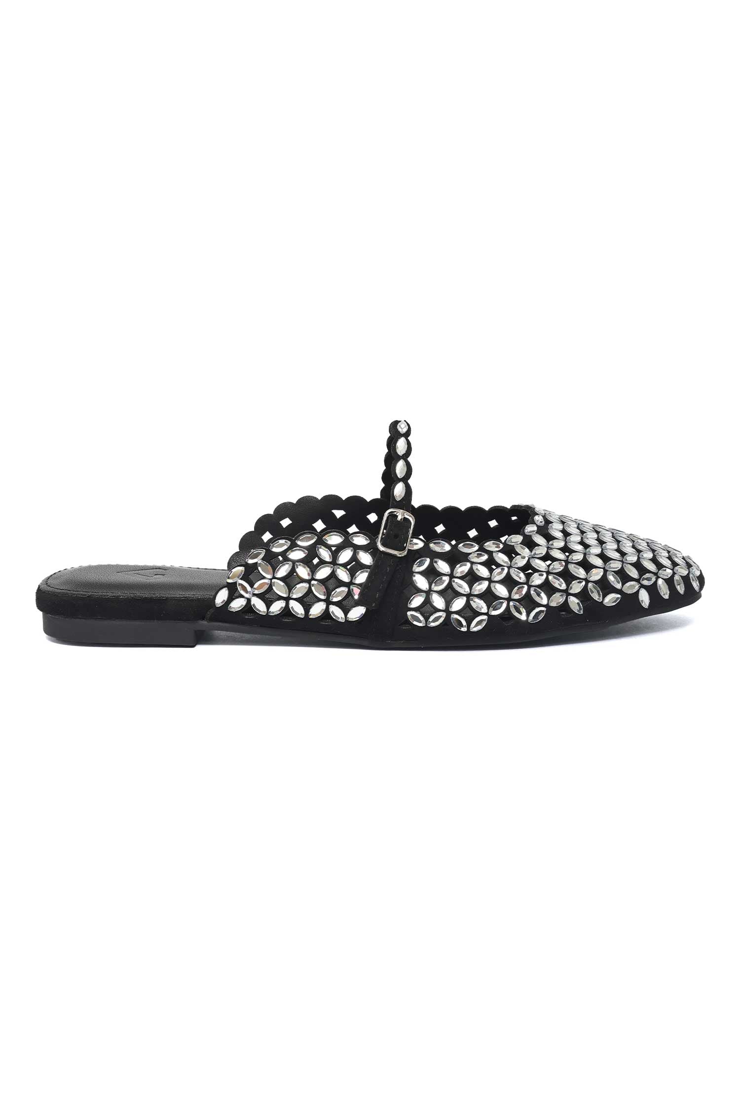 Artfully embellished with clustered gems over a scallop-cut vamp, these flats evoke an air of sophistication. Sleek profile with classic Mary Jane line. Ideal for luxury lounging or elevated city styling.