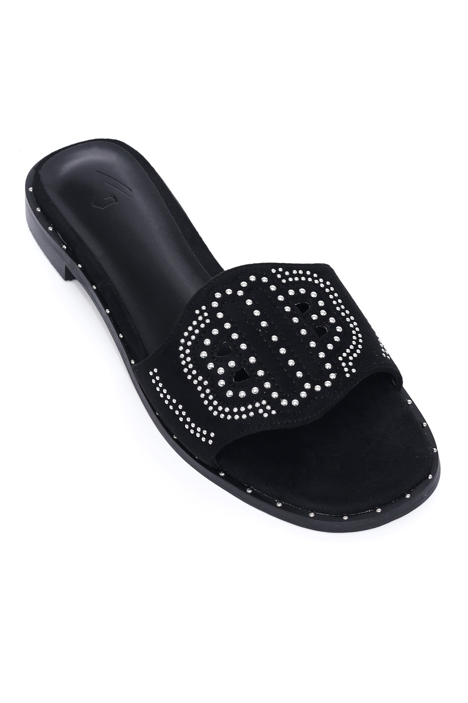 Elevate your casual elegance with these chic studded slip-on sandals. Designed with a bold geometric cutout pattern on the strap, adorned with shimmering metallic studs, these sandals offer a sophisticated yet edgy appeal.
